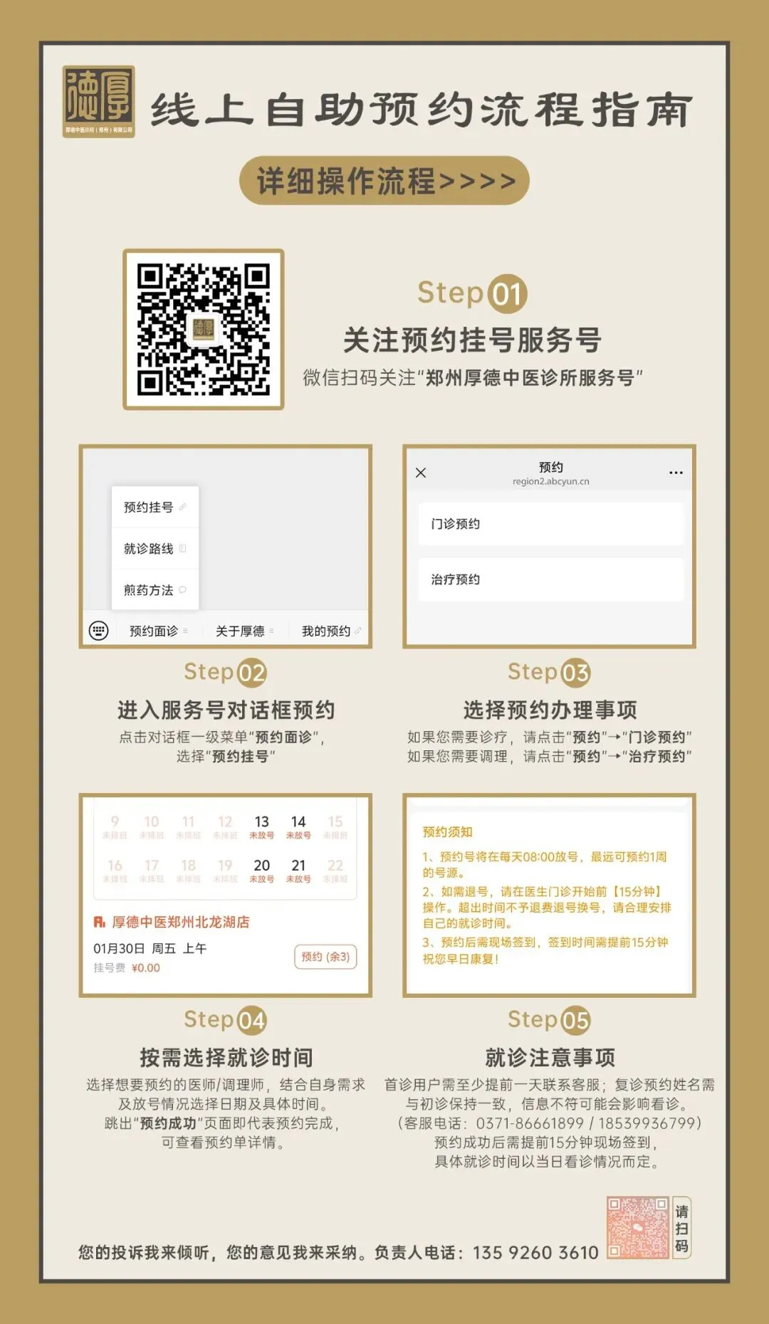 春节放假期间如需预约,您可在微信公众号内搜索【郑州厚德中医诊所服务号】-【预约挂号】,也可联系185 3993 6799(同微信)