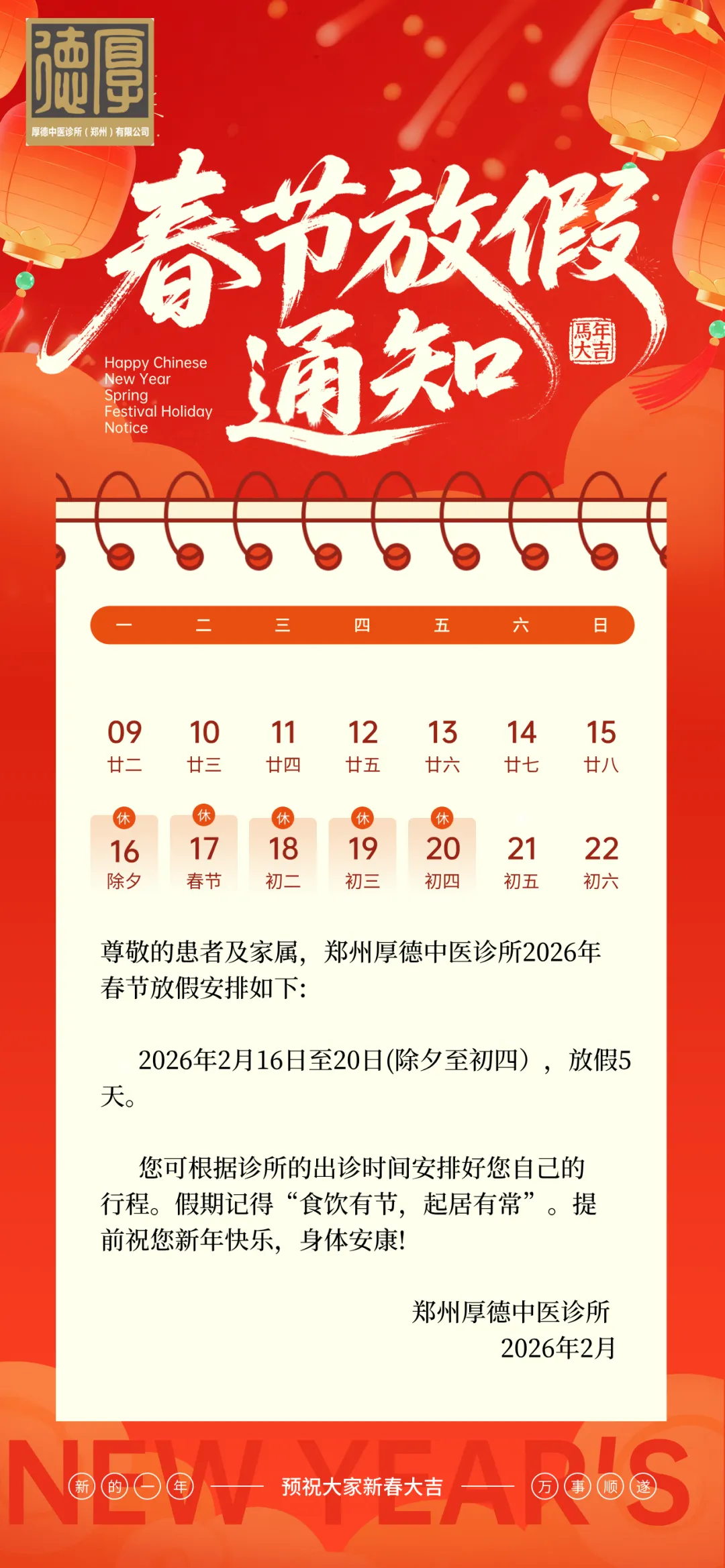 尊敬的患者及家属,郑州厚德中医诊所2026年春节放假安排如下: