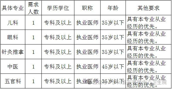 为完善医院人才梯队建设,报请上级主管部门批准,现招聘儿科、眼科、针灸推拿、中医、五官科执业医师各一名,共5人。