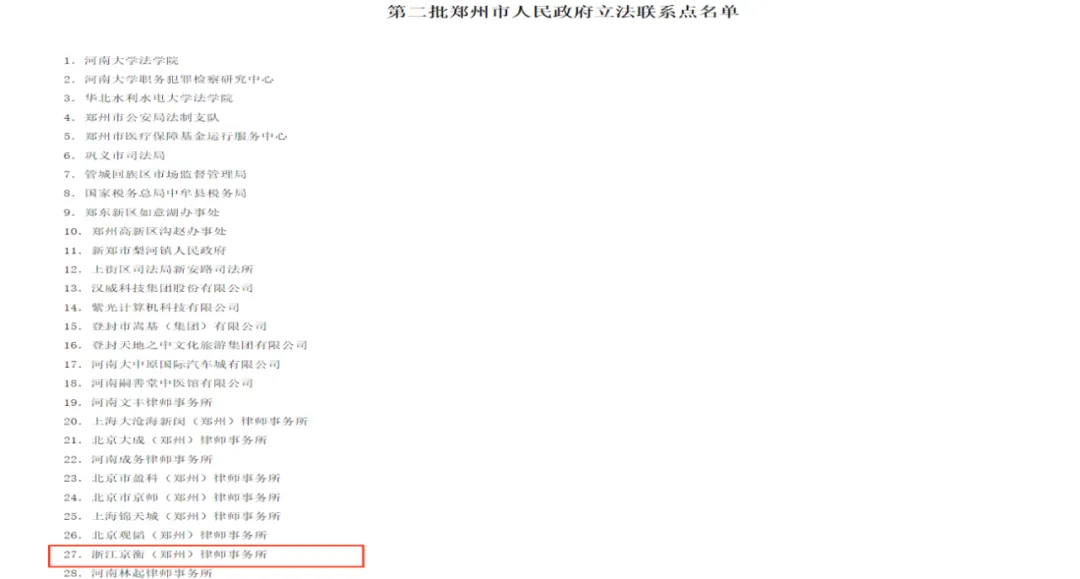 2023年,京衡郑州所获得司法部授予的“全国公共法律服务工作先进集体”荣誉称号,律所党支部获得“全省律师行业先进基层党组织”荣誉称号。凭借业务领域的出色表现,京衡郑州所被《商法》月刊评为卓越综合实力律所(华北),被律新社评为“律新社2024年度区域臻选律所-华中”。