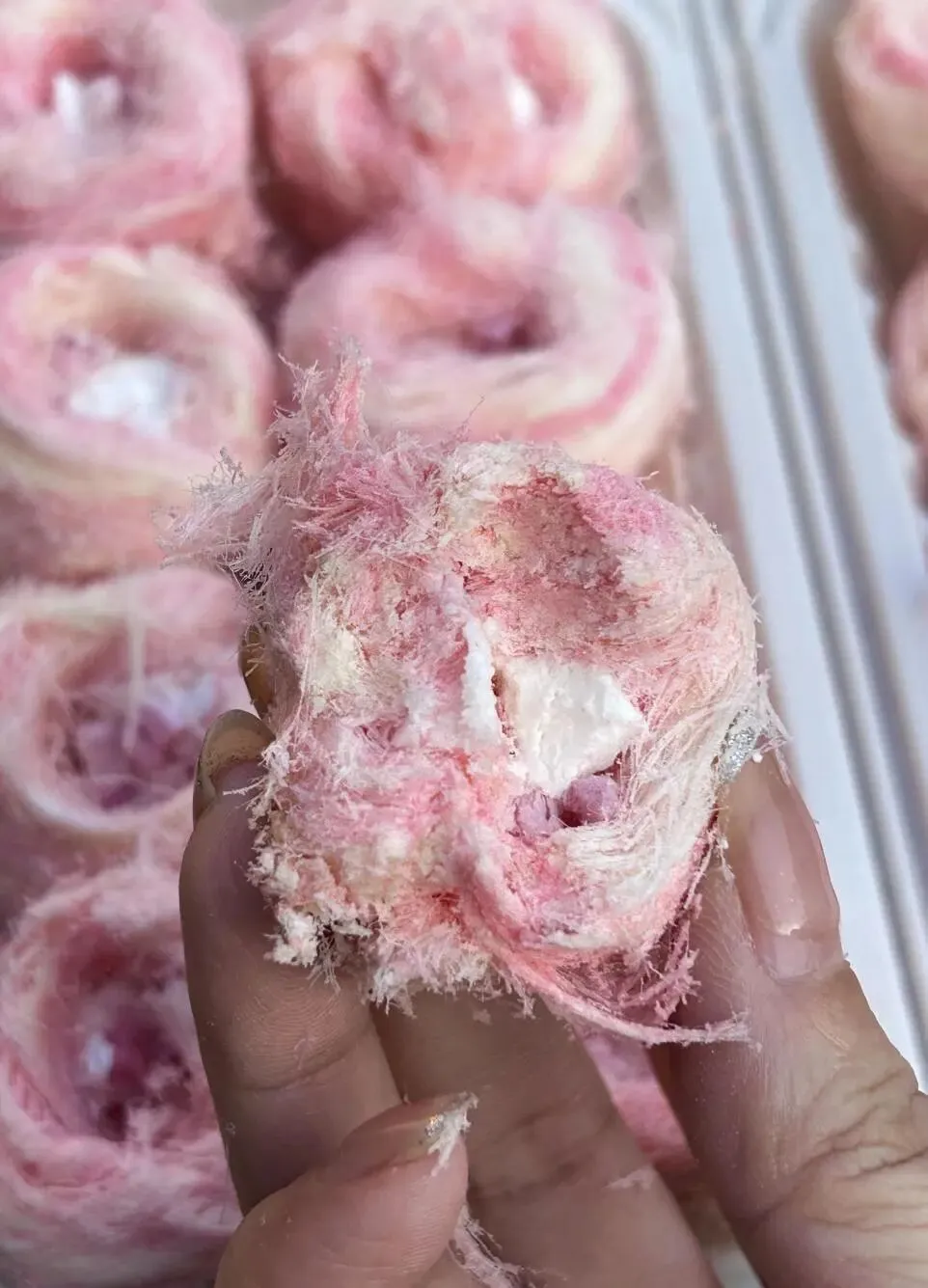 谁懂这个??在一个老爷爷那买到的!!店看着好多个年头了,位置可隐蔽,人还挺多!!路过看到刚好!打包了一点!!我也不知道是啥,但是还挺好吃的,酥酥的入口即化,里面有奶油!!!粉粉的也很好看!!