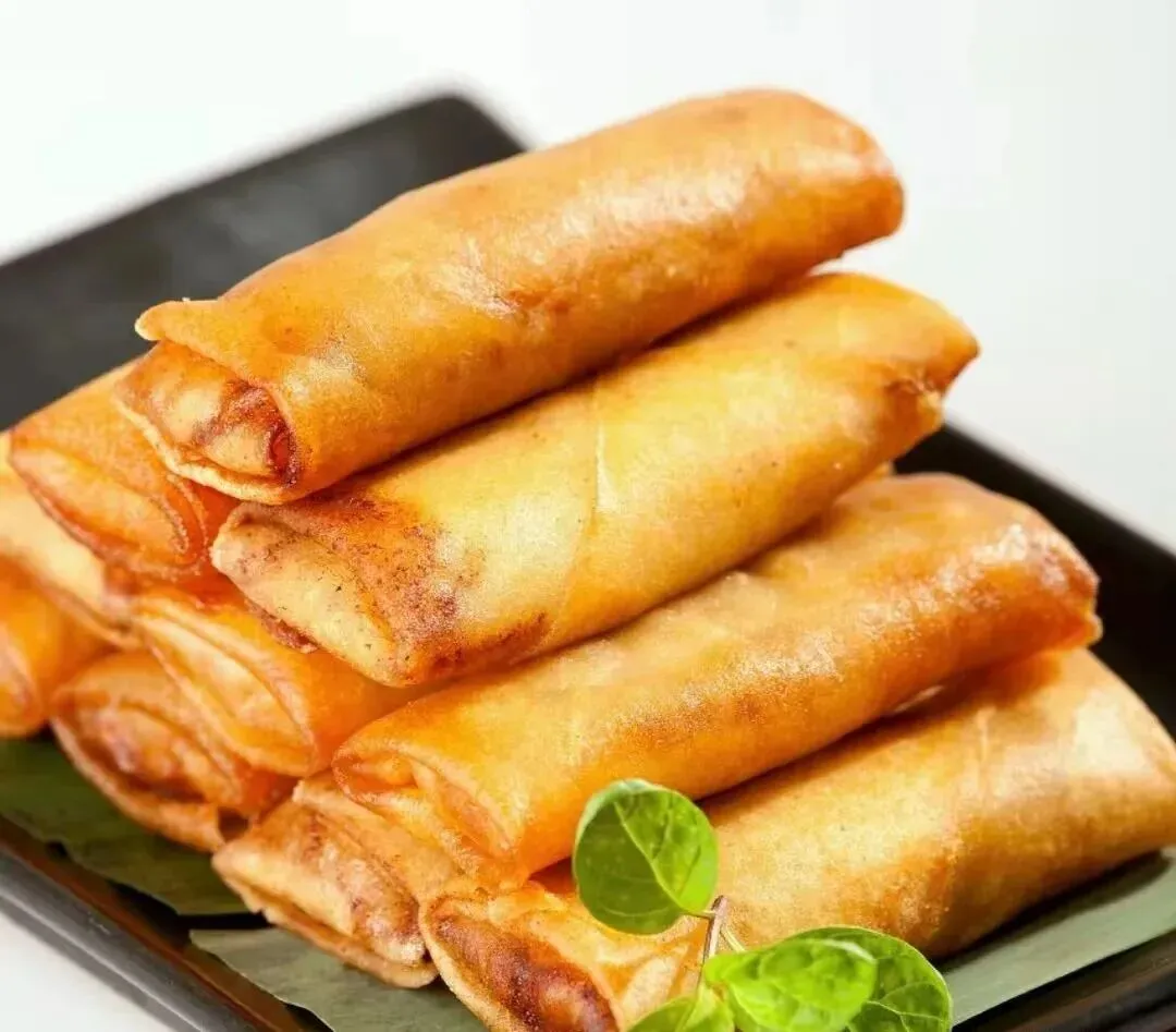 8.最后卷成长扁圆形的小包,春卷就包好了。