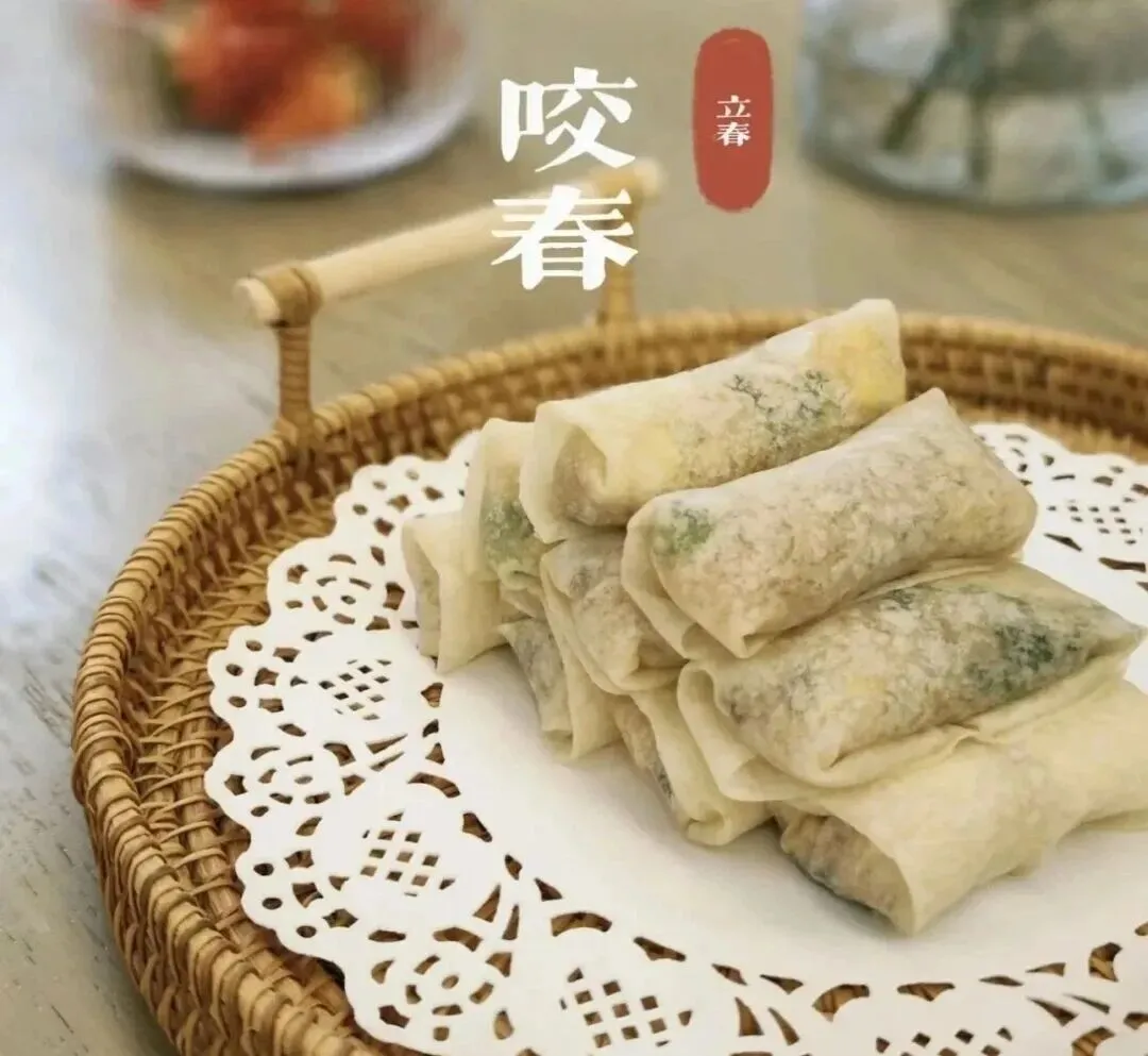 立春日时令饮食是做春饼、赠春盘、食春菜等饮食之俗,以迎春、庆春。春饼是立春日典型的时令食品,从魏晋南朝时代起,人们迎春食春饼。《荆楚岁时记》载:“立春之日,亲朋会宴,啗秦饼、生菜,帖‘宜春’二字。”春饼是一种薄面饼,取生菜、果品、饼、糖等置于盘中,取迎新之意,时称“春盘”,也可赠送亲友品尝。