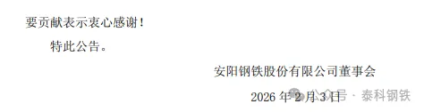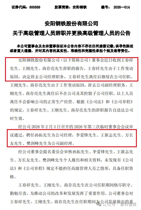 安阳钢铁股份有限公司2月3日发布公告,董事会近日收到王春祥先生、王刚先生、商存亮先生辞职的报告。