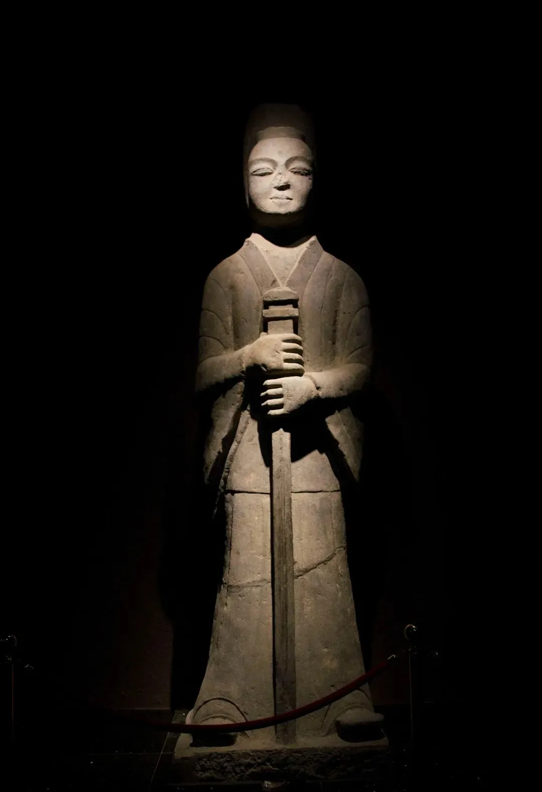 与之交相辉映的是北魏石翁仲,这尊石刻高约 2.3 米,为北魏皇室陵前的守卫石刻。石翁仲头戴官帽,身着宽袖朝服,双手执笏板于胸前,身姿挺拔直立,神态肃穆庄重。