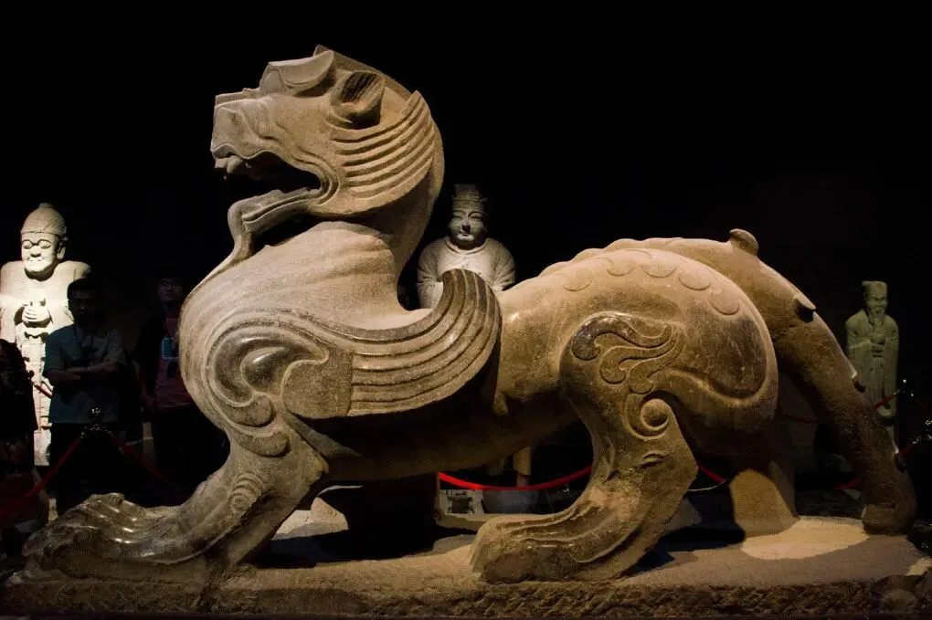厅内的“镇厅之宝”当属东汉石辟邪,这尊石刻高约1.9 米,长约2.9米,以整块青石雕刻而成,体量雄浑壮观。辟邪昂首挺胸,四肢粗壮有力,双翼展开作腾飞之势,头部独角弯曲,双目圆睁,嘴部大张露出獠牙,既充满威慑力又不失灵动之气。
