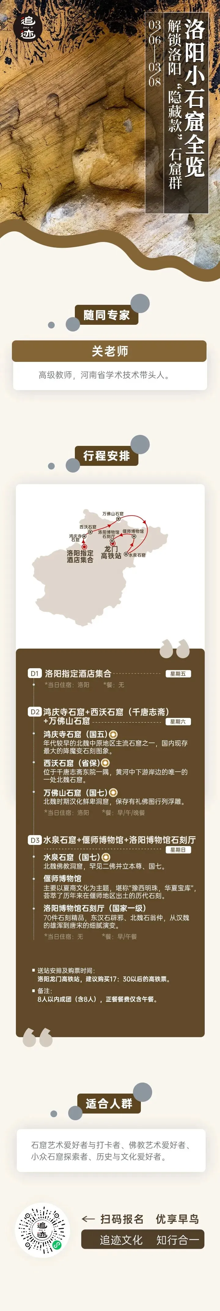 这次不仅探访鸿庆寺、西沃、万佛山、水泉四大石窟,更将走进偃师博物馆与洛阳博物馆石刻厅,串联起从北魏到唐宋的石刻艺术脉络。