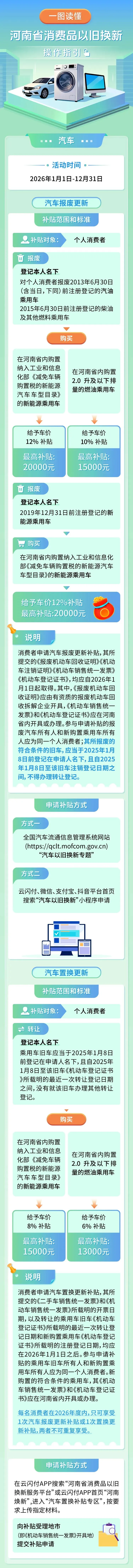 一、汽车报废更新补贴:个人消费者报废登记在本人名下乘用车,购买纳入减免购置税车型目录的新能源乘用车,补贴车价的12%(最高不超过2万元);购买2.0升及以下排量燃油乘用车,补贴车价的10%(最高不超过1.5万元)。