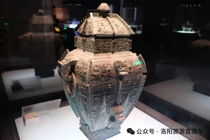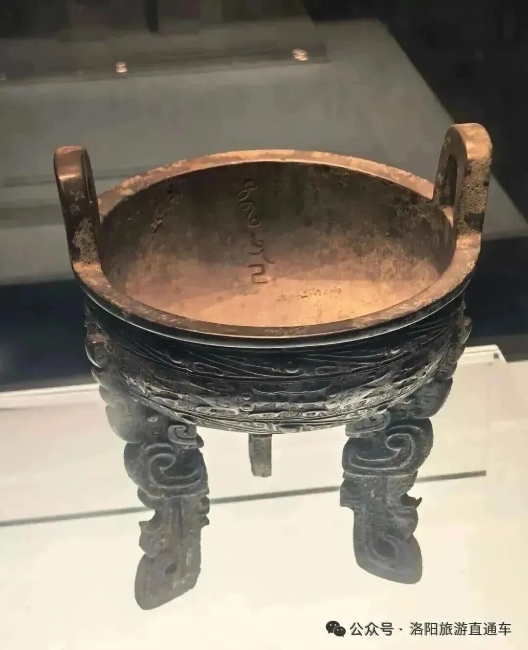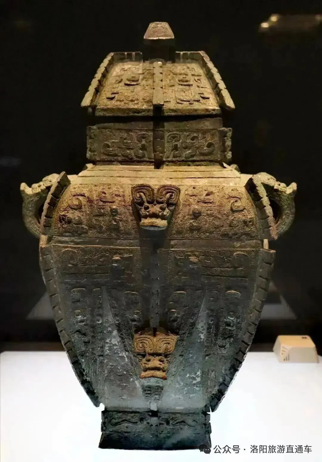 它也被俗称为洛阳鼎,云雷纹打底,正中是怒目圆睁的兽面纹饰。据说它是一件西周的文物,方鼎直腹,深浅浮雕交替,饕鬄巨目狰狞,衬托出王室的尊严,让人想起那句诗:“雄都定鼎地,势据万国尊。”