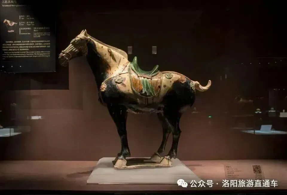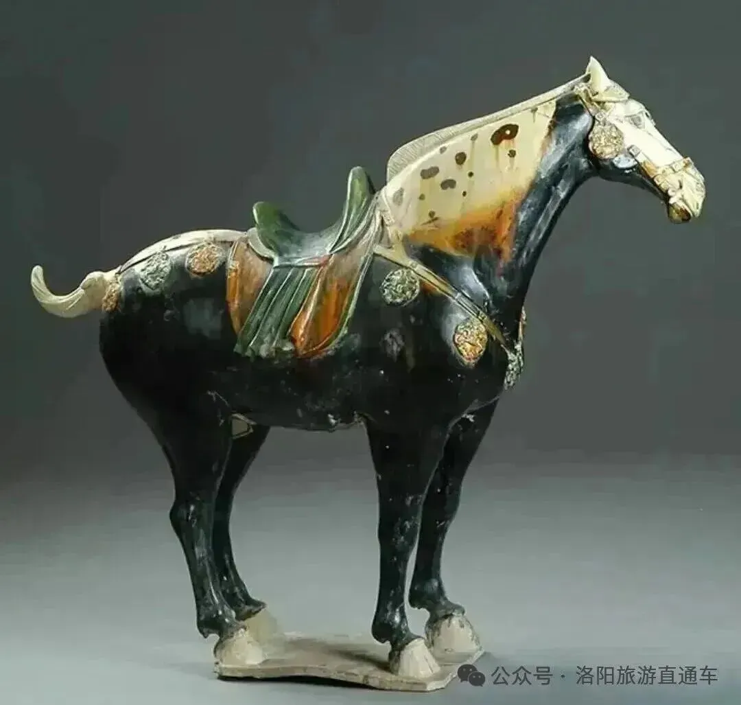 它的长度约为84厘米,高度约为73厘米,全身主要都是黑釉,只有马面,鬃背,马尾、马蹄采用白釉,显示为白色,是文献中“龙种神驹、四蹄踏雪”的艺术再现。此马造型强劲有力,鞍鞯俱全,体态雄健,气势雄伟,是目前我们国家唯一能见到黑釉唐三彩之一,代表了唐朝时期唐三彩烧造技术的较高水平。