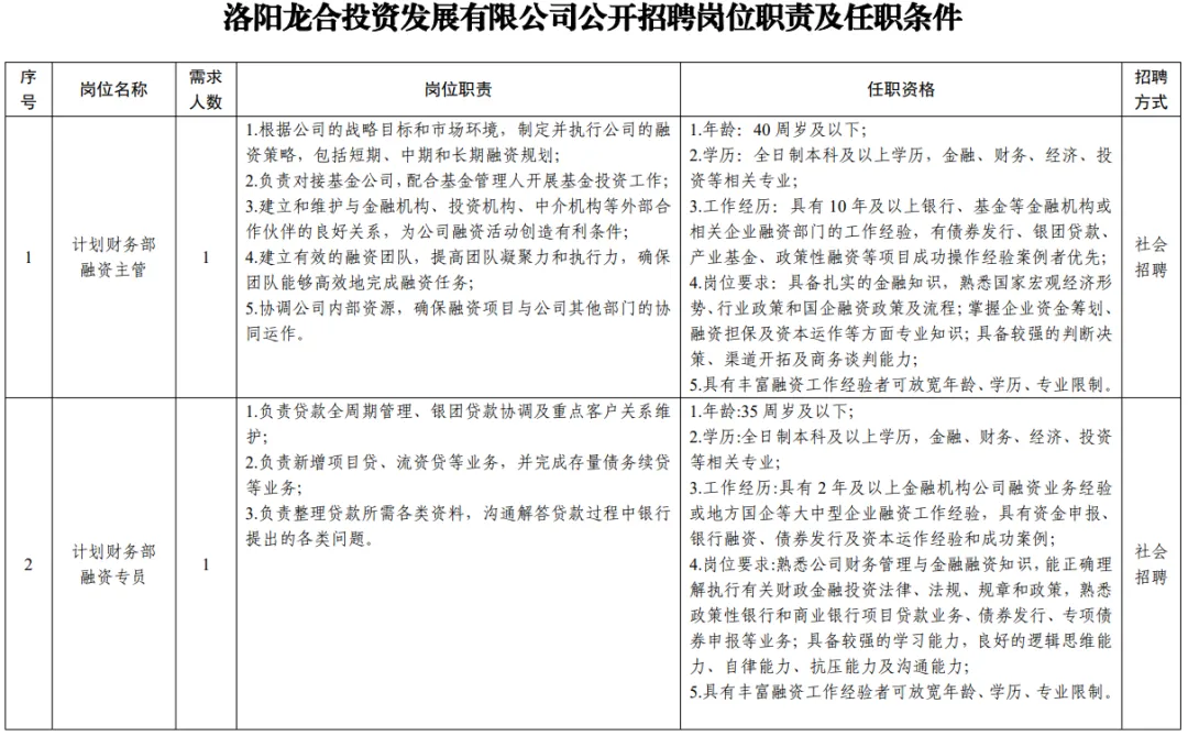 附件:《洛阳龙合投资发展有限公司公开招聘岗位职责及任职条件》