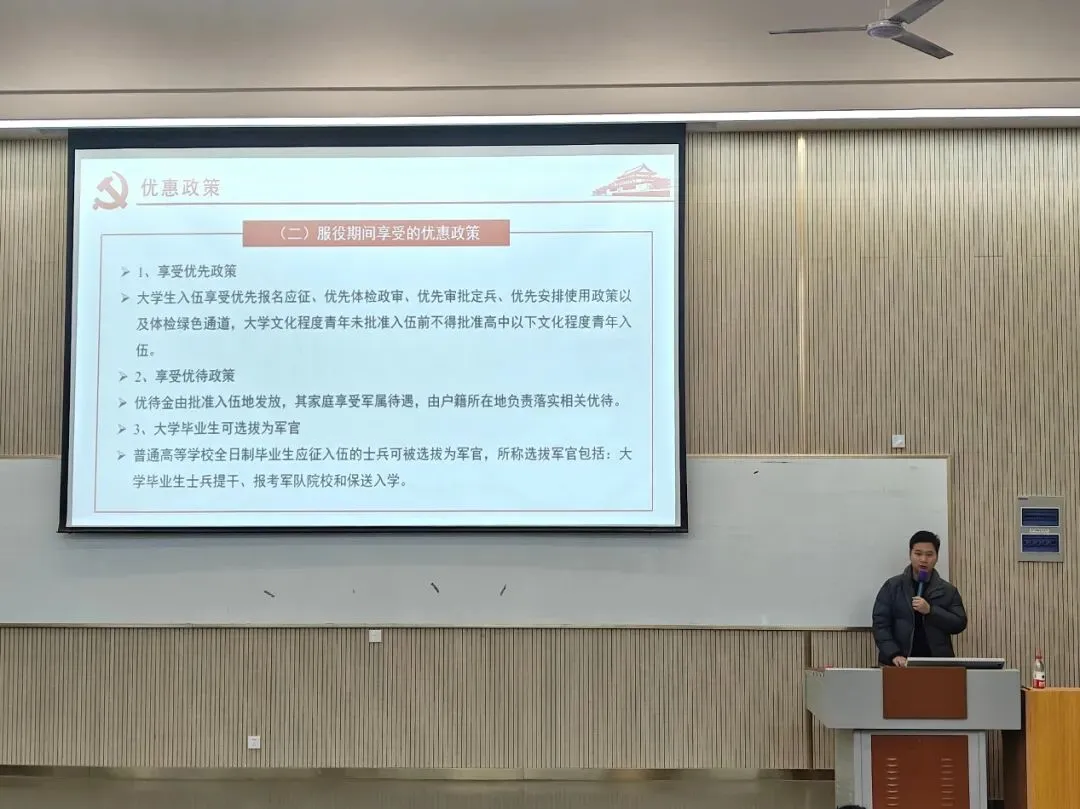征兵工作负责人介梦波老师结合学校退役复学学生的从军经历,用生动的语言、丰富的案例,深入浅出地向学生们解读了国家最新的征兵政策,描绘了军队生活的多彩画面,以及参军对个人成长、国家发展的深远意义。并针对大学生普遍关心的学业保留、学费补偿、退役安置等问题进行了重点讲解,让同学们对征兵政策有了更加清晰、全面的了解,消除了他们心中的疑虑,进一步激发了他们内心的爱国情怀和向往军营的强烈愿望。