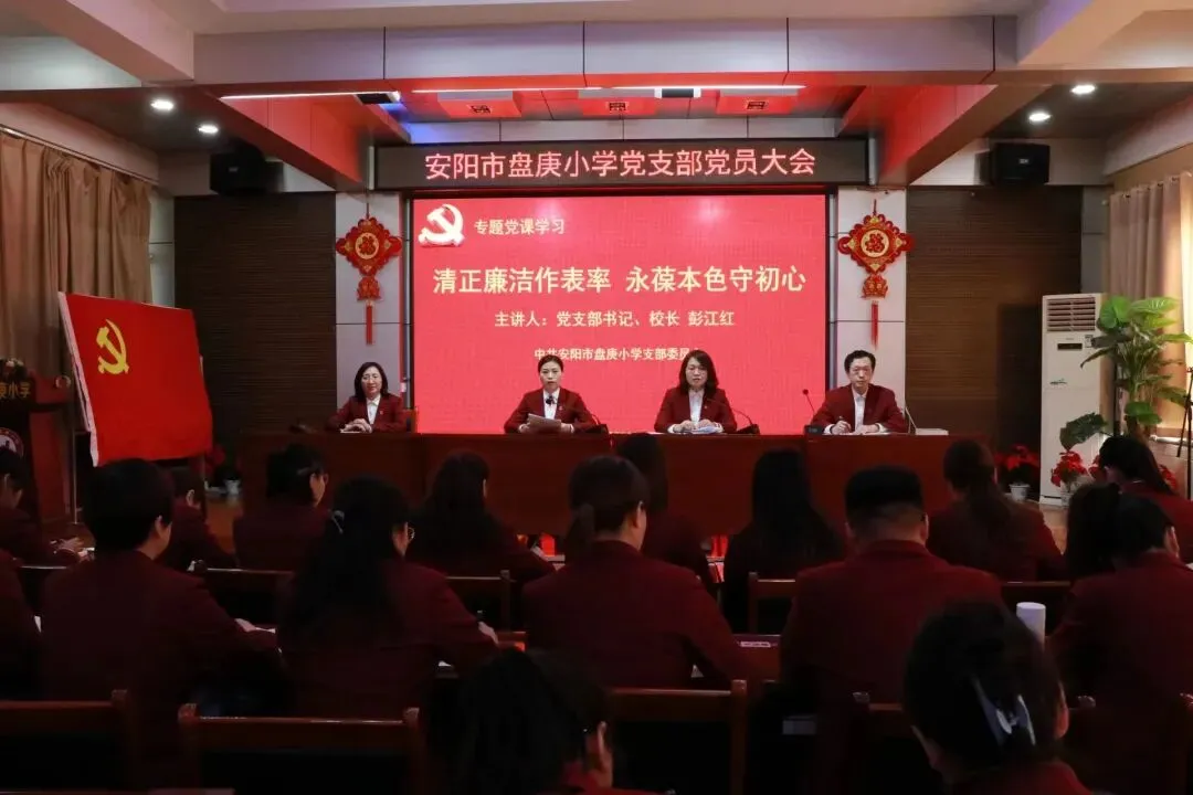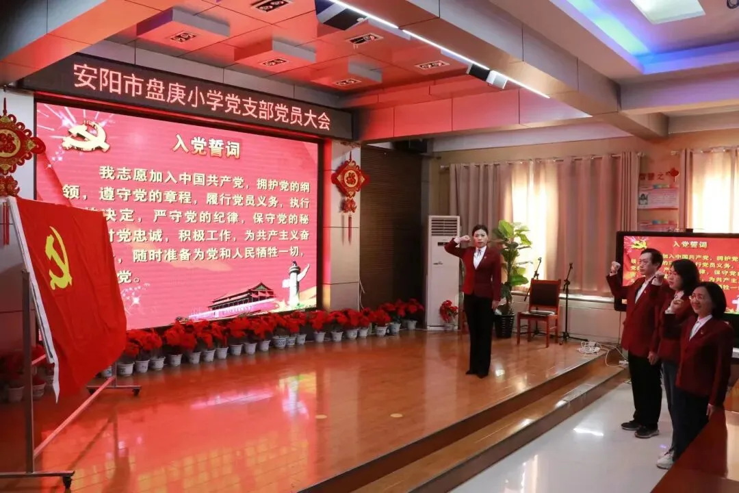 安阳市盘庚小学党支部始终高举习近平新时代中国特色社会主义思想伟大旗帜,全面贯彻落实党的教育方针,紧紧围绕“根文化”教育,坚持“党建引领融合发展”,以“红色引擎引领发展、红色标杆引领民生、红色旗帜引领师生、红色力量引领队伍、红色链接引领特色”的“五个红色、五个引领”为主线,聚焦为党育人、为国育才。将我校党建工作融入学校各项工作中,打造六个特色工程,培根铸魂展现新担当,守正创新展现新作为,以高质量党建推动学校事业高质量发展,培养具有中国根基的世界人。