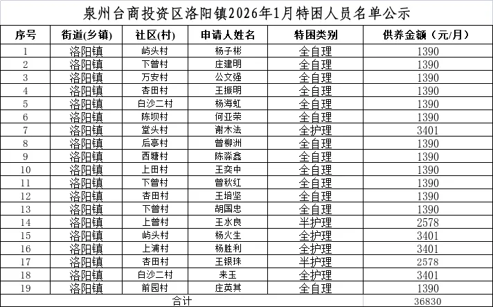 >名单公示|洛阳镇2026年1月特困人员、低保发放名单公示