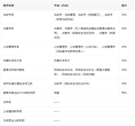 根据2024年6月官网显示,设置10个教学系部,建有治安学、侦查学、公安管理学、刑事科学技术、网络安全与执法、铁路警务、警务指挥与战术7个本科专业和治安学专业城轨安全与执法1个专业方向,覆盖法学、工学2个学科门类