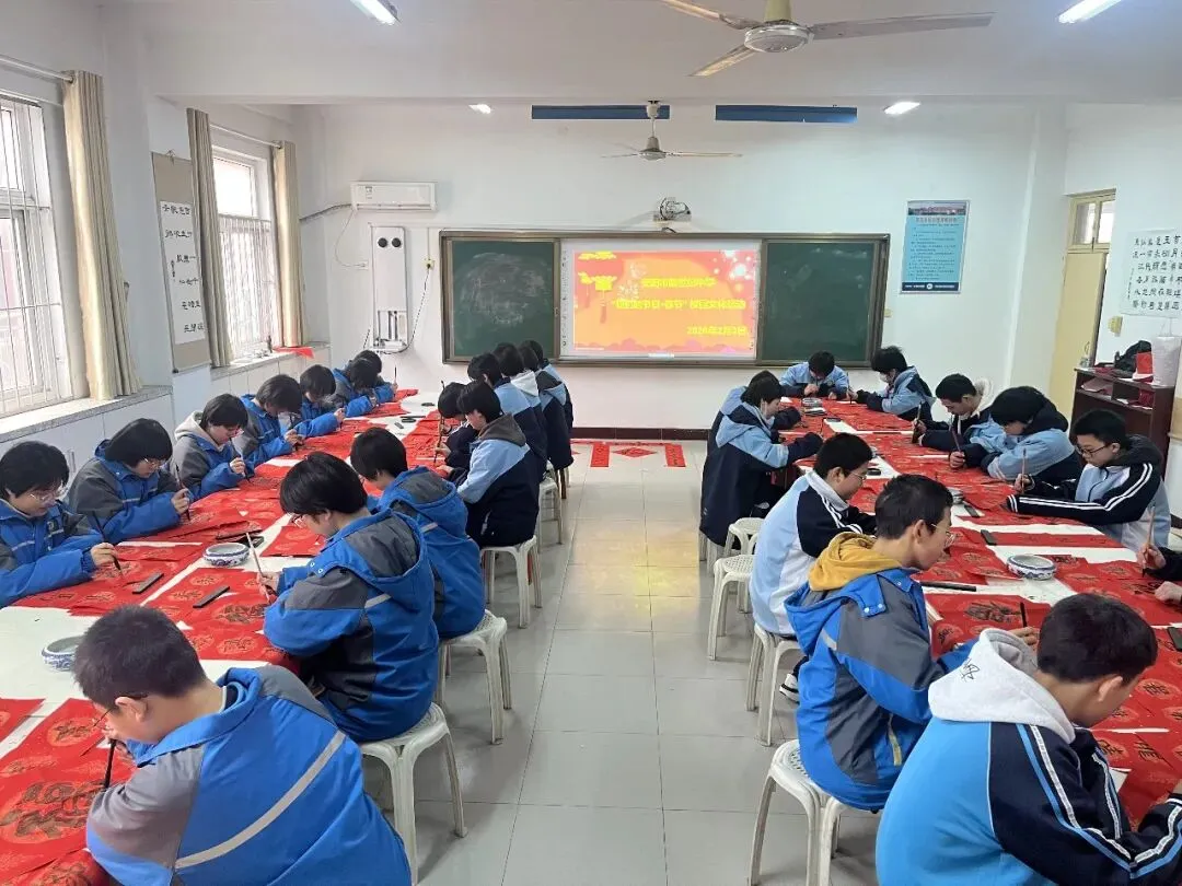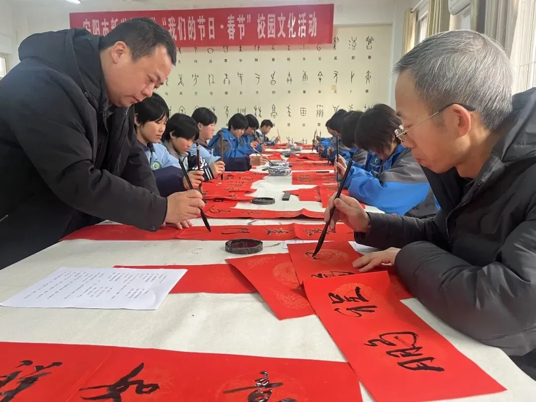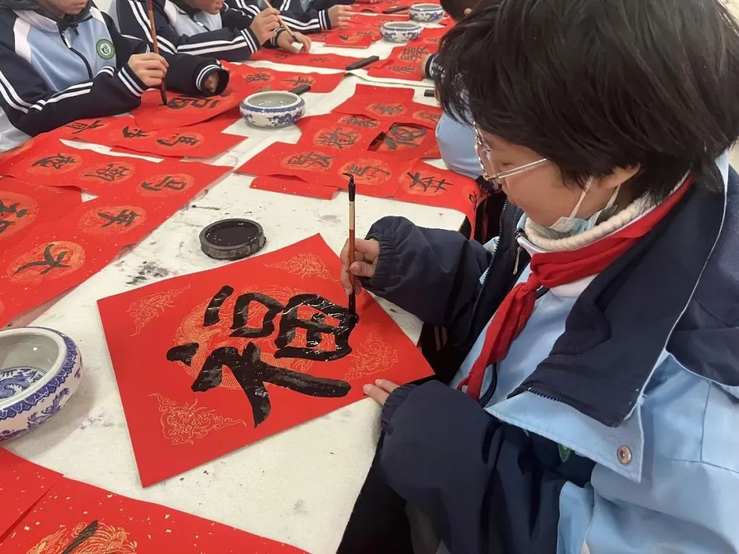 首先,我校部分师生在学校书法教室内开展了“写春联”文化活动。活动中,教师讲解春联文化与书写技巧,学生创作并展示优秀作品,营造墨香迎新春的浓厚氛围。书写过程中,同学们相互交流、取长补短,在切磋技艺的同时,感受集体创作的乐趣。