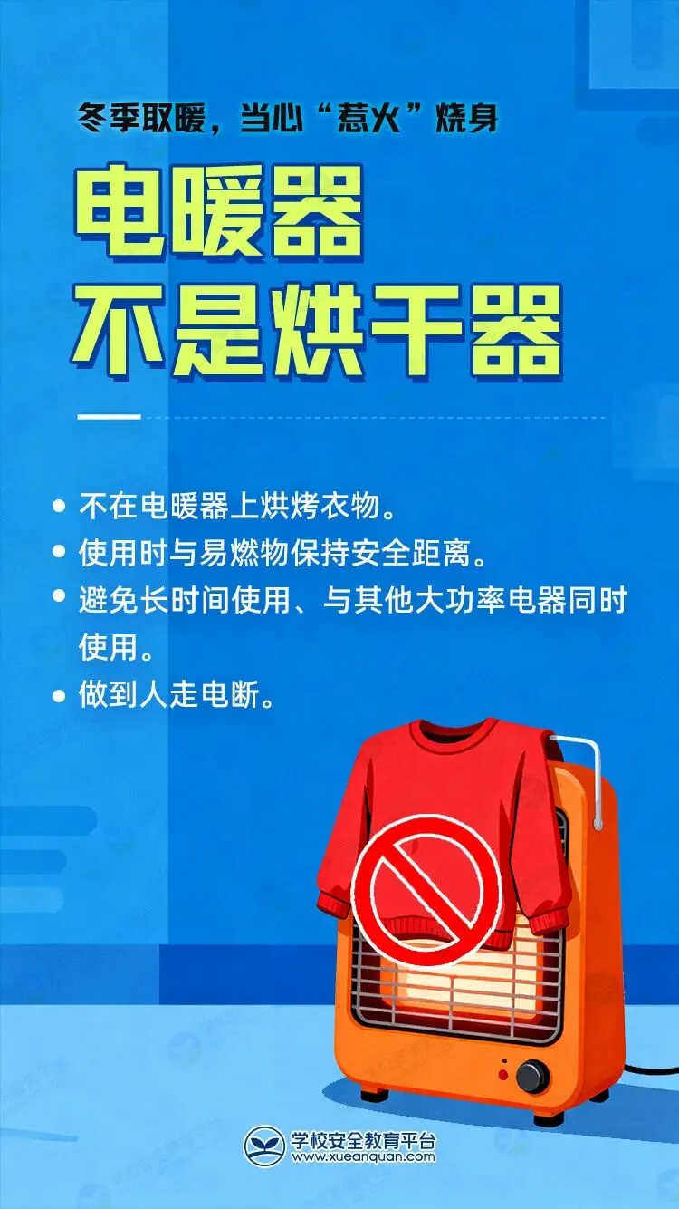 1.冬季使用电取暖设备,需通过正规渠道选购合格产品,严格按照使用说明操作,使用时与窗帘、被褥等可燃物保持安全距离。