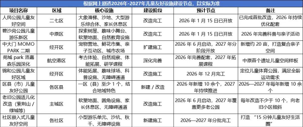 在当时大型游乐场为数不多的情况下,大象滑滑梯几乎成为了50后以来的最受孩子欢迎的明星,被磨的光滑的水泥表面承载着每个孩子在嬉戏打闹,滑行的场景,而这个造型深深的印在了大家的记忆里。但是随着时间的发展,水泥滑梯有了安全隐患,在21世纪初被拆除,从人民公园彻底的消失了,成为不少人的遗憾。打造了以小象乐园为主题的游乐场所,位置在人民公园西北角。坐地铁达到人民公园站,然后从西门进去,会比较近,这个主题公园占地约3千㎡,就是对老郑州大象滑滑梯的一个复刻。一进去,左边是一个大型的蓝色小象滑滑梯直接呈现在大家眼前。大象滑滑梯的腹部站满了排队等待的孩子们,而家长在外面等待的间隙,也没有闲着,不少人在拍照。大象滑滑梯的右边就是摇摇椅,秋千等,每个年龄阶段设置不同的活动区域。不得不说,为了赋能城市人文精神,建设儿童友好型城市,郑州一直在发力。2022年,郑州成功入选首批儿童友好城市建设名单。从那时开始,郑州就开始把让儿童优先的理念融进城市的框架和规划中,比如街角树立的安全标语,街角公园设置的长凳子,再比如,儿童友好型公园的建设。而从2022年到2025年期间,郑州新建改建儿童友好公园 30 余处,利用城市公园广场、社区公园、街角游园场地增加游玩设施 160 余处,已构建起全域儿童友好公园体系。诺,我们不妨来看这些,你会发现不仅是新建的公园里有儿童设施,一些原来的公园也开始改造。比如管城时代公园,在建设之初都已经把规划做好,设计了树阵广场,儿童活动场地,滑板场,植物迷宫等多个运动场地。在这两天除了人民公园外,碧沙岗公园也打造了棕榈园的儿童游乐新区竣工开放。增设了探索树屋、趣味小舞台等设施,地板采用环保软塑材质,将自然元素与游乐设施巧妙融合。还有高新区莲花公园的改造,这个位置位于莲花街公园北园的位置,原先以为是一个缝缝补补的公园,没想到围绕沉砂池打造了一个坡地景观,还设计了儿童游乐场所,把公园跟周边居民的生活联系的更加紧密。不只是增强儿童的游乐设施,还会寓教于乐,在公园给孩子们科普知识。西吴河科普公园就是一个典型的案例,在这个公园里科普比较多,不同科学家的雕像,名言警句等等,有些直接扫码就能出来,方便家长给孩子讲解。其实很多人,不知道的是,在2024年,郑州植物园、青少年公园等 9 个公园被评为星级儿童友好公园。对于儿童友好公园的建设,实质上就是一个城市生活场景的转变,从盖房子,修路到生活场景的改变,这是很重要的一步。让孩子们安全优先的情况下,释放天性,让孩子在自然探索区域认识自然,促进孩子的社交,还有也会减少大家的育儿压力,轻松实现亲子陪伴的场景,也会提升城市公共服务水平。近年来,郑州的努力远不止于建设儿童友好公园,为了能让大家体验到郑州的人文特色,给大家营造美好的生活场景,不满足于细节的服务,开始拼命建设公园。很多时候城市的活力不是靠花很多钱,而是靠观念的更新:真诚服务的细节!在城市建设的过程中,或许一条小长凳,一个跷跷板,一个望远镜等等,很小的元素就能给大家带来惊喜。这些注重大家参与感的设施,也是一个城市活力的体现,不知不觉渗透在我们的生活中。就比如一个老奶奶坐地铁回家,由于年龄大体力不支的时候,正好在地铁口看见一条长凳,以及利用修建地铁时剩下的边角,形成的一个小街角公园。以高新区为例,你在街头走一走,你会发现不知道什么时候,这座城市带给你了这么多的改变。沿着西三环-翠竹街-莲花街这条路走,之前的一个个小土坡,都变成了公园绿化。不同的这种小街角公园都有不同的主题,设计不同的景观。从道路到建筑的过渡,中间加一些羊肠小道,夏天走在郁郁葱葱的景色里,比走在空白的人行道更添加了一些韵味。地块比较大的,会做不同的场景,广场,孩子游玩场所等,成为一个小型公园的微缩版。让大家的生活更加便捷化,完美实现楼下公园,楼上家的状态,为街角增加活力。一条路延伸出大大小小的自然空间,而在这些中,绿色生态一点点繁盛起来,也留住了脚步匆匆的行人。如果非要在郑州选一个公园城市的典型案例,那么高新区或许树立了不错的标杆作用。把一个个闲置,零散的地方变成了具有人间烟火气的休闲场所。不仅如此,为了能让大家体验到郑州的人文特色,给大家营造美好的生活场景,郑州出台了《郑州市公园体系专项规划(2021-2035年)(草案)》。直接看规划愿景:10分钟进公园,半小时享自然,1小时游山水。