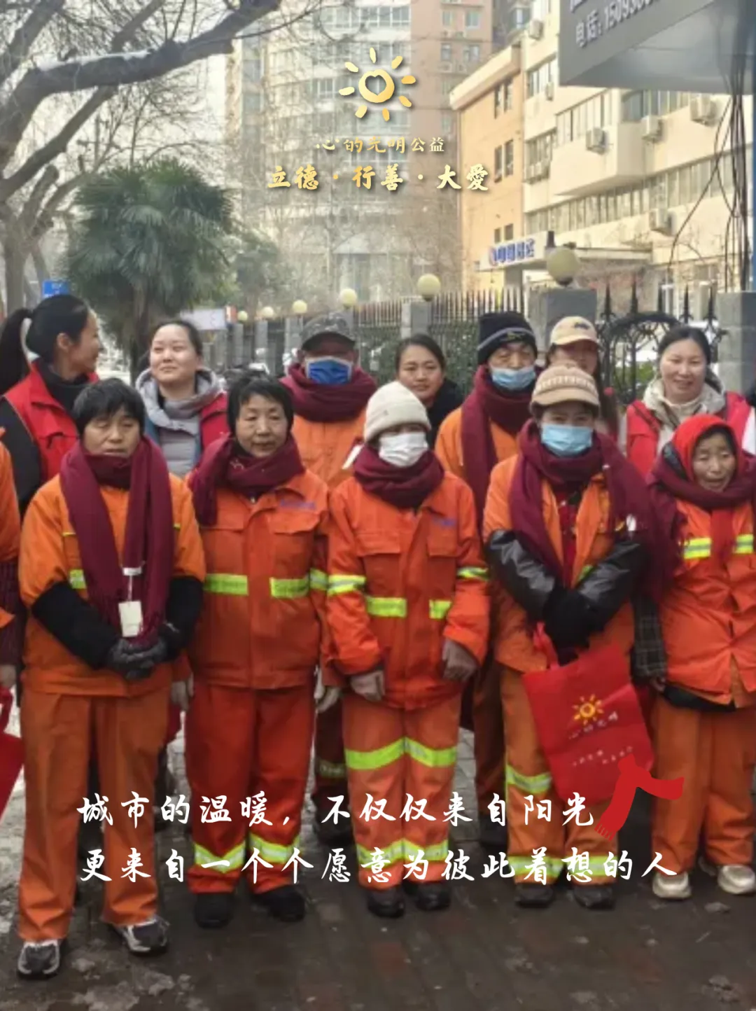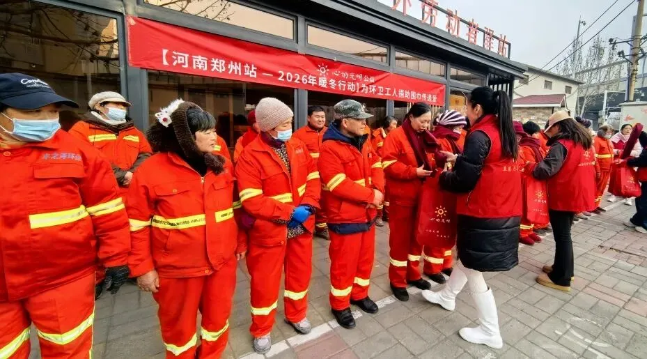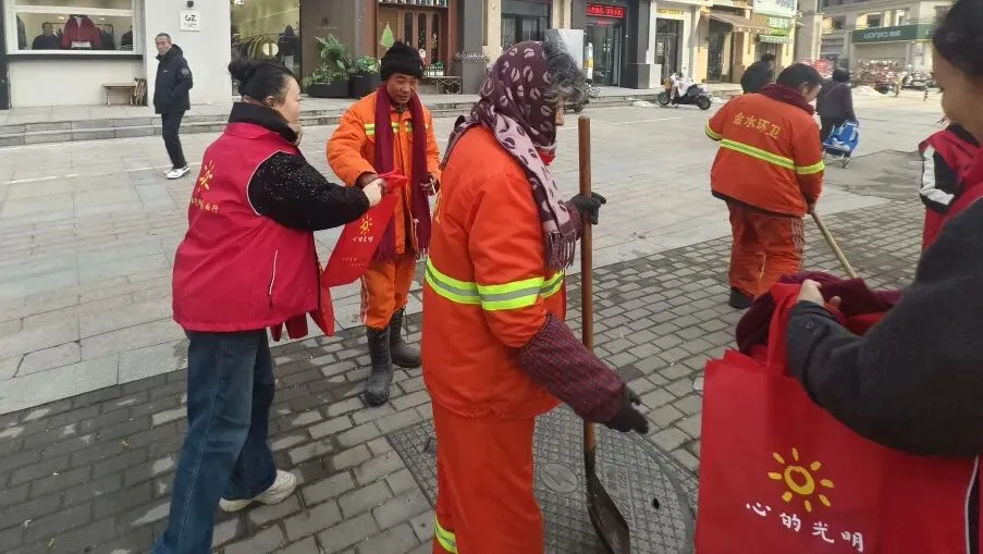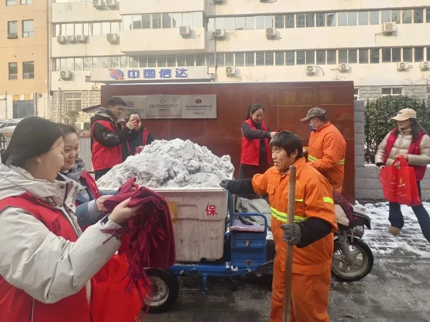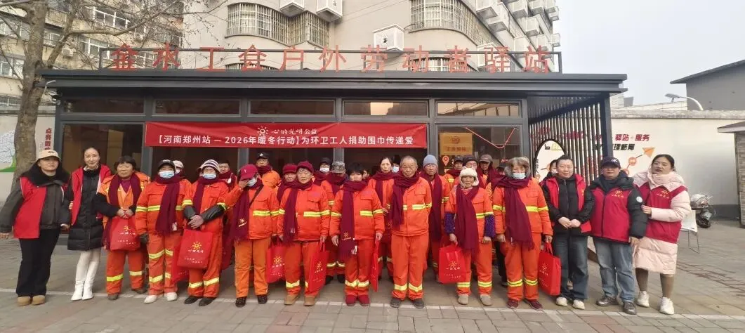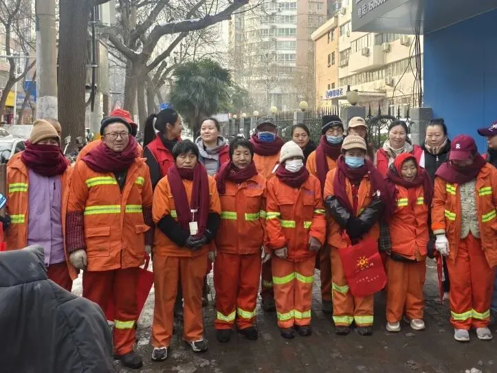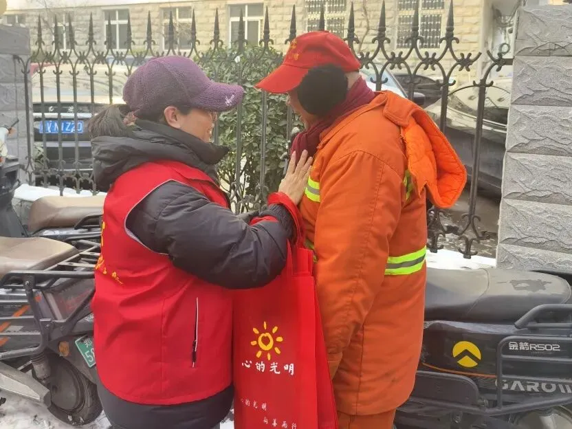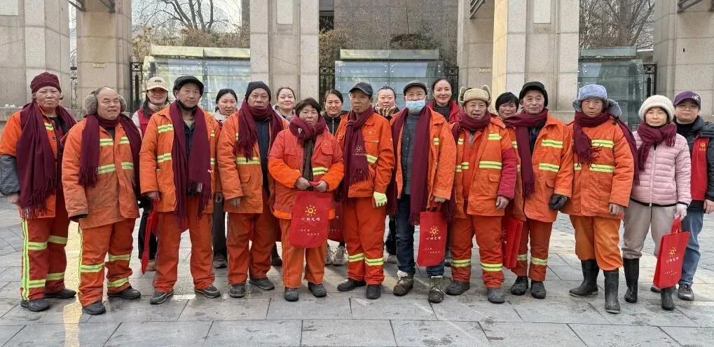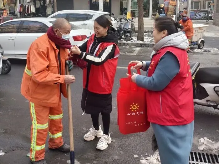 心的光明公益携手农业路丰庆路工会驿站、文化路街道农大社区,为100位在严寒中工作的环卫工人送上温暖围巾,20名志愿者共同参与了这场雪后的温暖行动。