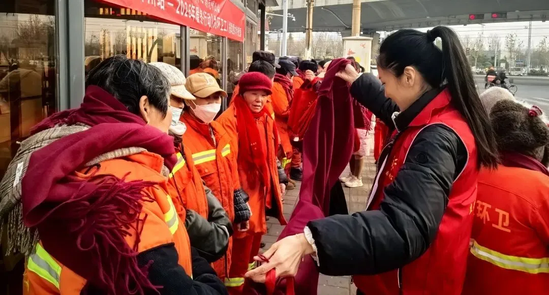 一位环卫大姐接过围巾时,手有些颤抖——不知是因为寒冷,还是因为感动。