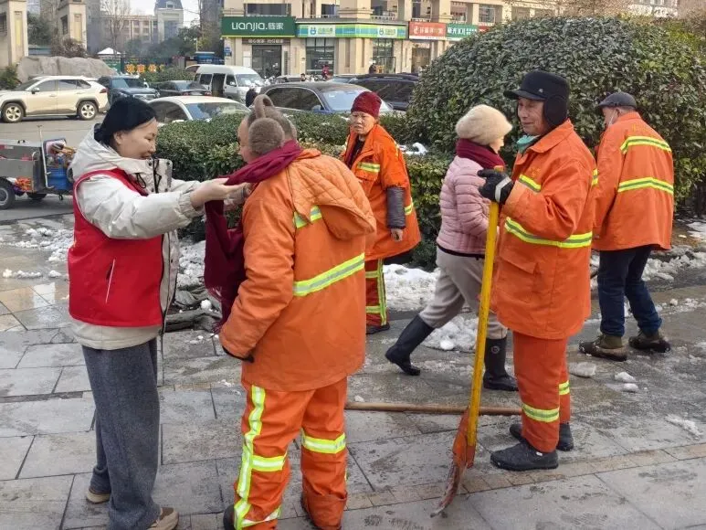 每遇到一位环卫工人,志愿者们都会停下脚步,双手递上围巾,并亲手帮他们系好。“叔叔,天这么冷,您辛苦了!”“阿姨,这围巾您戴着,暖和些。”