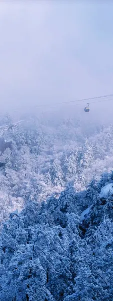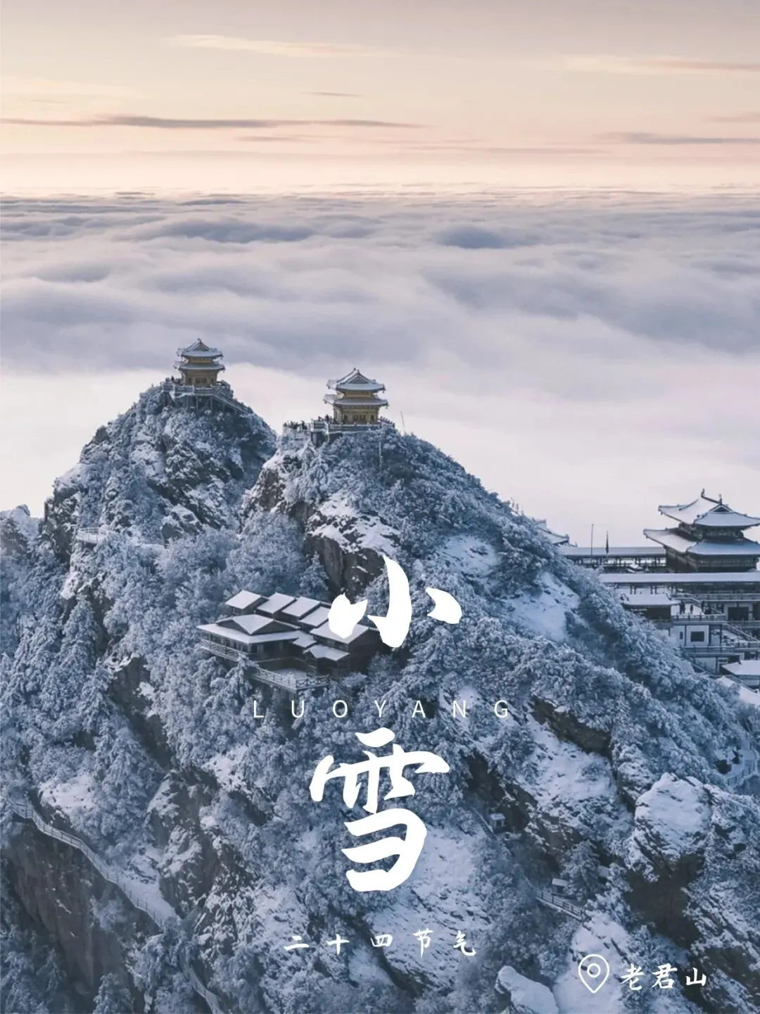 虹藏不见,闭塞成冬。初雪往往在此时飘落老君山。白雪覆盖着山峦与建筑,云海翻涌其间,宛若仙境,拉开冬日静谧而圣洁的序幕。