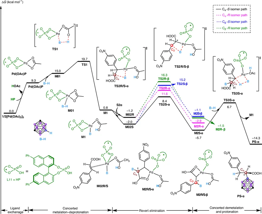 在CMD路径中,Pd(OAc)L11首先通过CMD过渡态(TS1)活化碳硼烷的B-H键,形成中间体M1。随后,关键的C-B键形成步骤决定了区域和对映选择性。计算发现,生成α-加成产物的过渡态(TS2S-α和TS2R-α)在能量上显著低于生成β-加成产物的过渡态(TS2S-β和TS2R-β),这与实验观察到的α-区域专一性一致。更重要的是,对于α-加成路径,(S)-构型过渡态TS2S-α的能量比(R)-构型过渡态TS2R-α低约2.4 kcal/mol,这完美解释了反应的高对映选择性。
