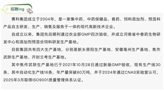 >郑州赛科药业公司招聘!双休、免费食宿等