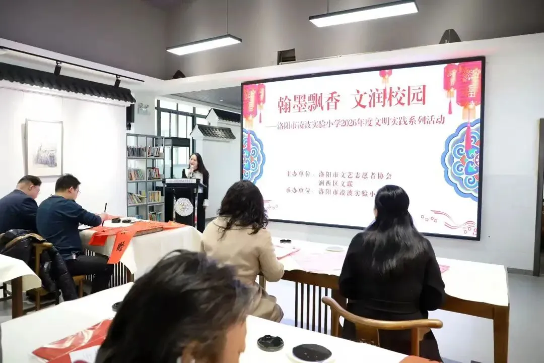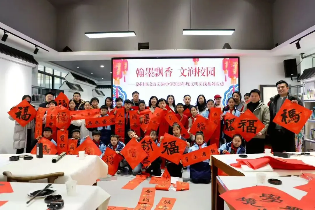 新春将至,年味渐浓。2026年2月3日,洛阳市凌波实验小学以“瀚墨飘香文润校园”为主题的迎新年写春联活动在此拉开帷幕。本次活动由洛阳市文艺志愿者协会牵头,联合洛阳市凌波实验小学及涧西区文艺志愿者协会共同承办,旨在以笔墨传情,弘扬中华优秀传统文化,为师生送上新春的第一份祝福。活动现场,教育界、文艺界等嘉宾齐聚一堂,共襄文化盛宴。活动在热烈的掌声中正式启幕,洛阳市凌波实验小学党支部书记、校长白卫红致开幕辞。致辞中不仅细致介绍了学校的办学特色与育人理念,更饱含对中华优秀传统文化的尊崇敬意,以及对新春佳节的美好期许,真挚的话语瞬间点燃现场氛围,赢得师生与嘉宾的阵阵共鸣。致辞结束后,现场迎来精彩的“春联创作互动”环节,书法名家现场挥毫示范,师生们热情参与、兴致盎然:有的虚心向名家请教笔法技巧,潜心研习;有的老师匠心构思、即兴创作嵌名联,笔墨间尽显巧思,引得现场喝彩连连。笔锋流转、墨韵生香,一幅幅寓意吉祥的春联跃然红笺,或祈愿阖家安康、岁岁平安,或寄语学子学业精进、前程似锦,更有满含赤诚的笔墨礼赞祖国繁荣昌盛、国泰民安。笔走龙蛇书祥瑞,联福迎春暖人心。此次活动不仅是一次传统文化的生动实践,更以艺术之名架起学校与各界的情感纽带。活动尾声,全体人员合影留念,定格这份温暖与感动。洛阳市凌波实验小学将以此为契机,持续推动墨香校园建设,让传统文化在笔尖传承,在心中生根,为新春添彩,为文化赋能。编辑 : 党政办公室