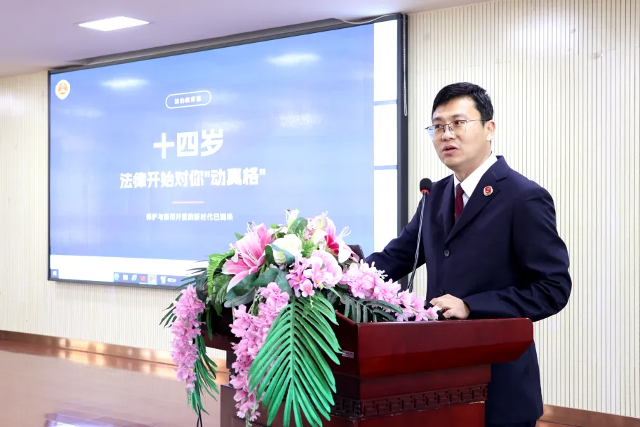 随后,法治副校长姜宝成为同学们带来了题为《法律开始对你“动真格”》的深刻讲座。他犀利地击碎了“我还小”“只是开玩笑”“网上没人知道我是谁”三块思想“挡箭牌”,用真实案例警示:十四岁起,法律责任已郑重“到账”。
