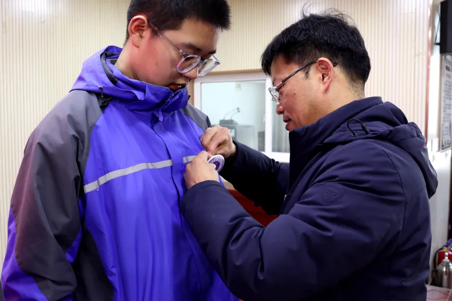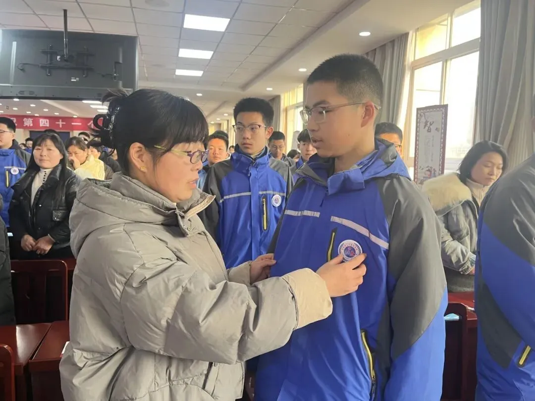 随后,张志云校长、姜宝成书记、黄卫国副校长以及陈振敏警官与家长共同为各班学生代表佩戴上特制的“十四岁法治徽章”。徽章在胸前闪亮,法治的信念在心中扎根。