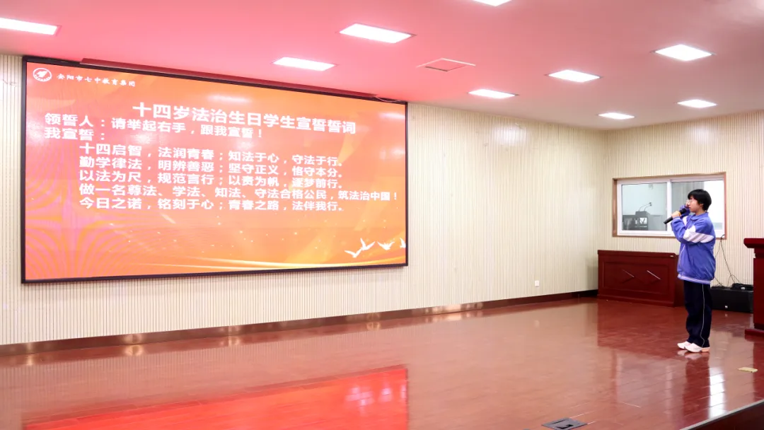 “我宣誓:十四启智,法润青春;知法于心,守法于行……”同学们肃然起立,紧握右拳,以青春最洪亮的声音,许下铿锵的法治誓言。这誓言,是告别懵懂的宣言,更是迈向成熟担当的启航。
