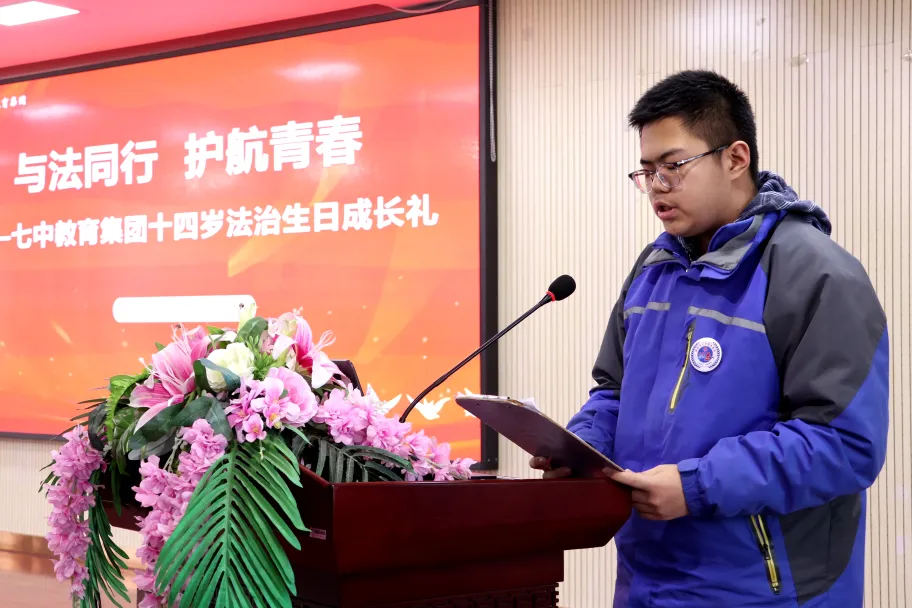 学生代表胥卓良发言,表达了对法治作为成长“铠甲”的深刻认同,号召同龄人将法治精神内化于心,从恪守校规校纪做起,系好青春“第一粒法治纽扣”,争做社会主义法治的忠实崇尚者、自觉遵守者、坚定捍卫者。
