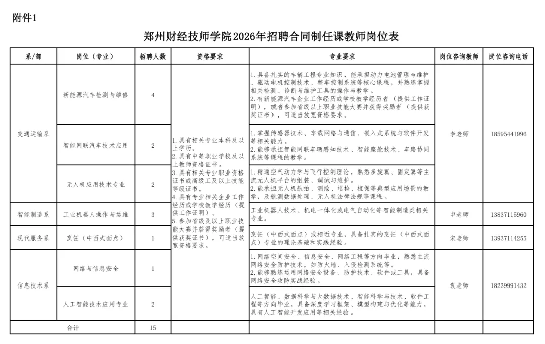 本次招聘合同制任课教师15名,具体岗位及要求详见《郑州财经技师学院2026年招聘合同制任课教师岗位表》(附件1)。招聘外聘兼职教师19名,具体岗位及要求详见《郑州财经技师学院2026年招聘外聘兼职教师岗位表》(附件2)。(相关附件可点击下方链接至学院官网下载)