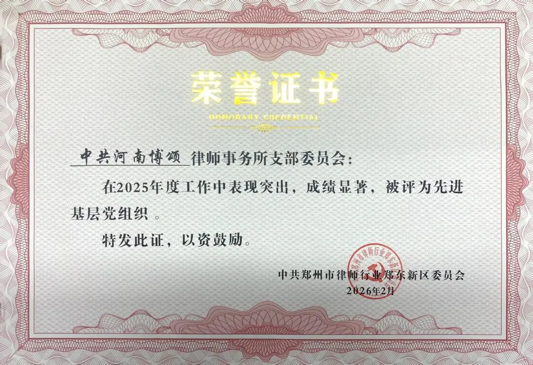 此次获奖是荣誉,更是责任!河南博颂律师事务所党支部将以此为契机,珍惜荣誉、再接再厉,持续深化党建与律师业务深度融合,不断提升党建工作质量与律所专业服务水平,为服务经济社会发展、推进全面依法治国贡献更大力量!
