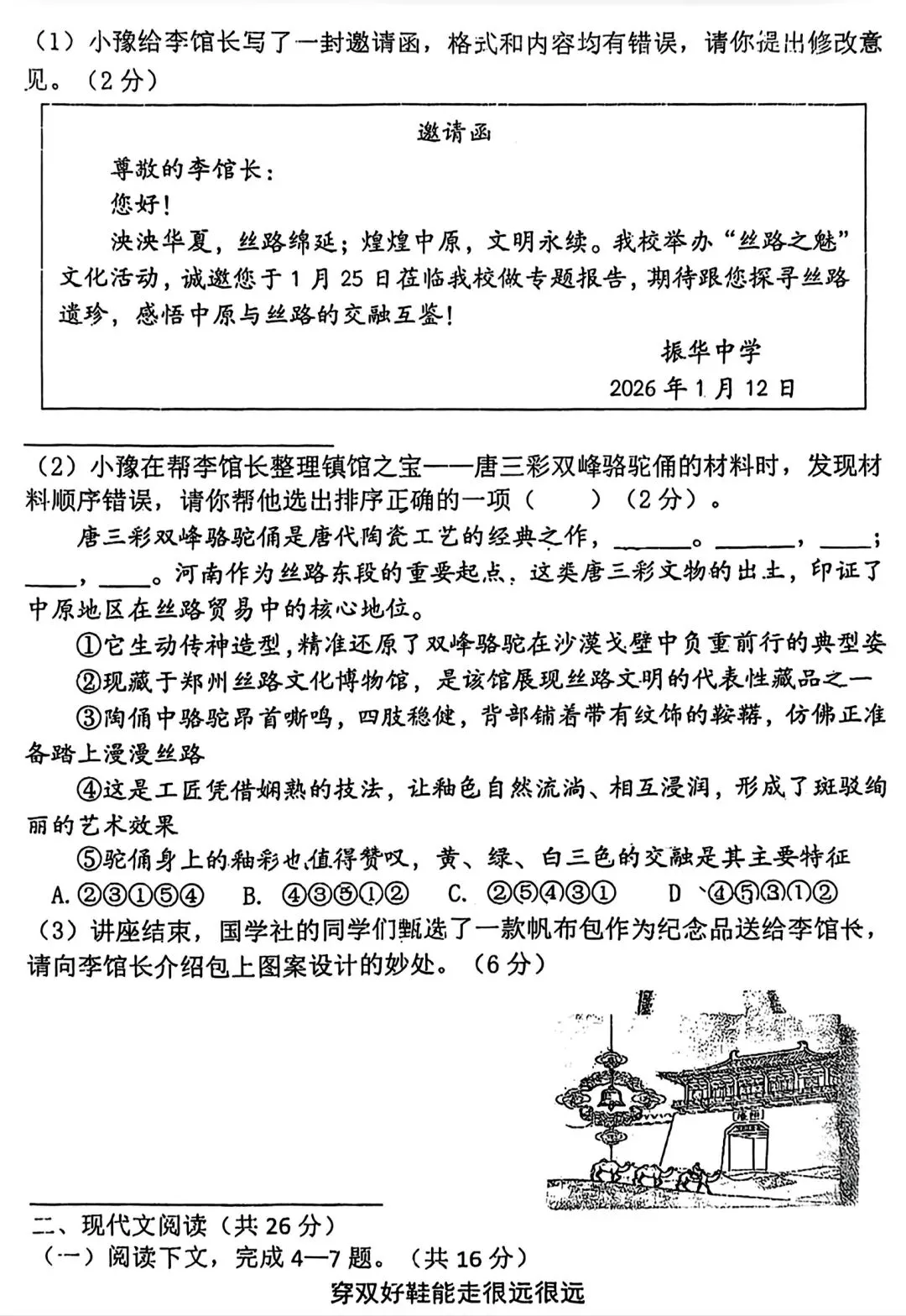 >郑州外国语中学2025-2026学年九年级上学期期末考试语文试题及参考答案