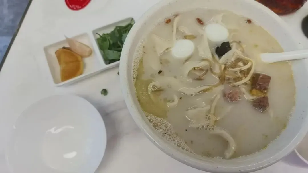烩面的汤底是羊骨汤,乳白胶状,味纯而鲜,除劲道的手工宽面外还有百叶、粉丝、海带、鹌鹑蛋、姜丝、木耳、枸杞、羊肉,吃时辅以蒜瓣、脆萝卜、姜片和少许辣椒,虽满头大汗但嘴停不下来,超有营养,超级大补!