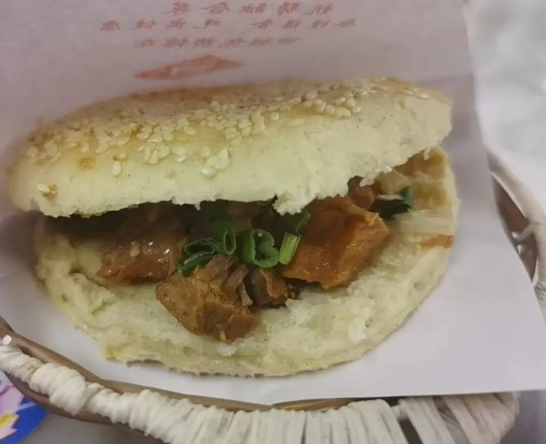 肉夹馍也超乎想象。馍的底部已金黄酥脆,上部洒满白芝麻,香味扑鼻;羊肉粒肥瘦相间而分明,肥肉粒爆汁而瘦肉粒耐嚼,夹于馍中,油汁浸入馍底,包装都因为吸油呈半透明状;羊肉粒上洒少许葱花、洋葱瓣,我再自作主张放入少许辣椒油提鲜。一口下去,如刘姥姥入太虚幻境,吃个肉夹馍,不抬头。