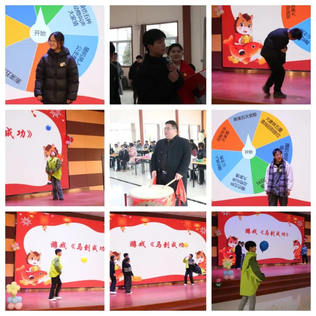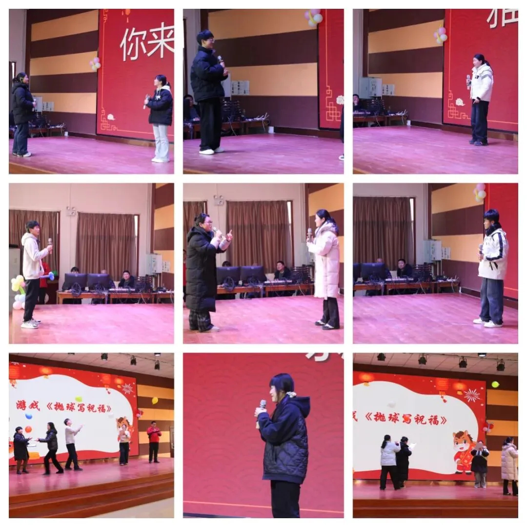 除了精彩的文艺节目,互动游戏环节更是将欢乐氛围拉满。《击鼓传花》的游戏让全体师生踊跃参与,幸运儿们展示的小才艺、送上的新春祝福,让现场暖意融融、欢声笑语不断;《气球穿衣》考验着同学们的速度与默契,大家齐心协力、奋勇争先,展现了班级凝聚力。