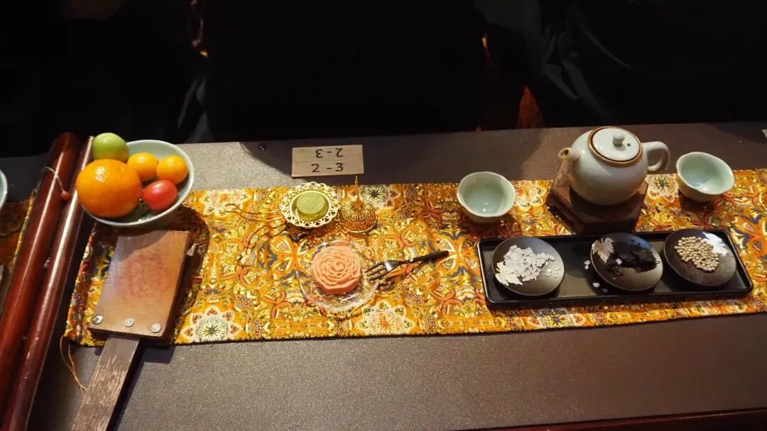 入场前,可以选阵营,我们选的是玄武,于是是NPC玄武带着我们进去。玄武告诉我们,我们的身份是商人,一会儿在宴席上要把各位大人伺候好了巴拉巴拉。我心想,怎么一来就低人一等呀!入席以后有餐食,我一度以为是有专门环节,安排我们去吃,结果只吃了一块饼儿,忽然听得列位请有序离席一类的话。我仓惶收拾相机等,终于顾不得桌上,好在妈妈以席卷之势收走了我桌上的水果和糕点,总算不觉得太亏了。