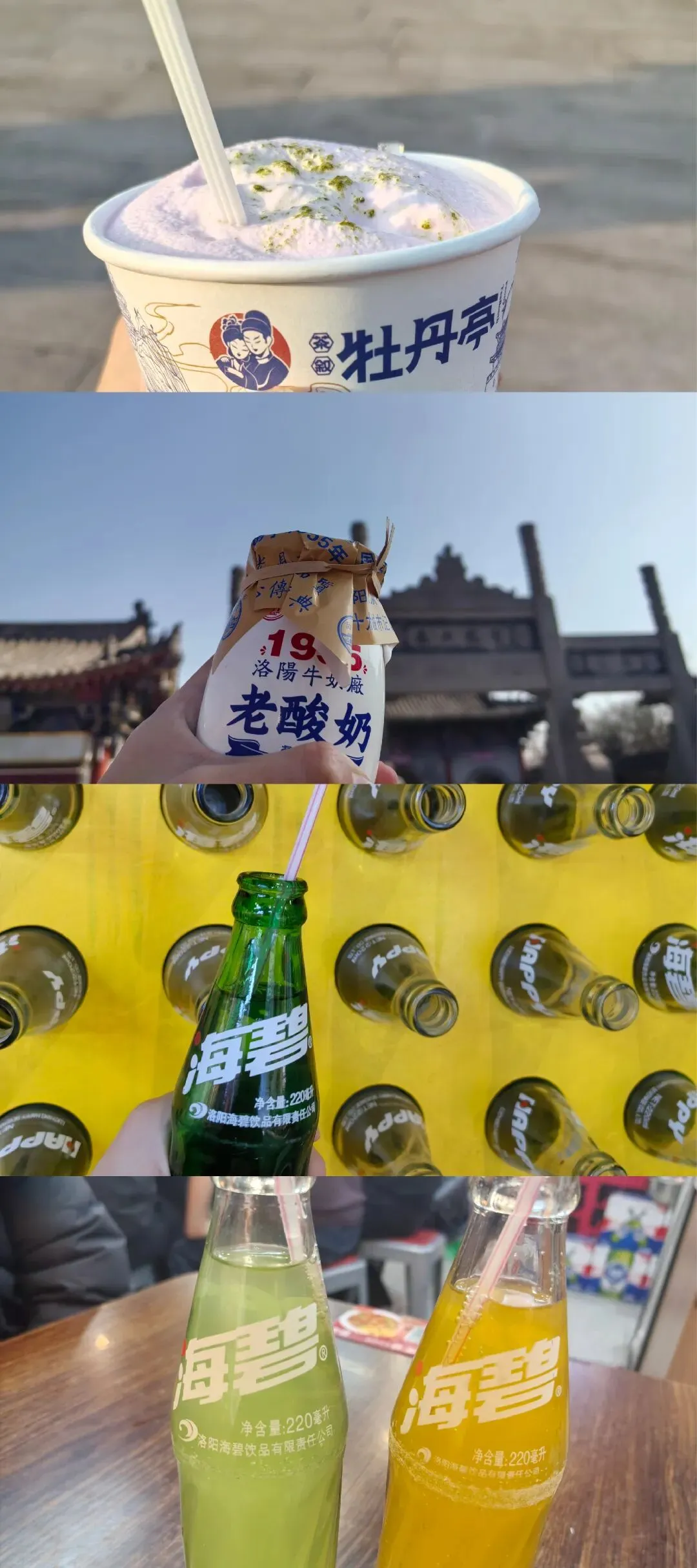 洛阳的饮品方面,有喝牡丹亭、白马寺的酸奶和海碧。