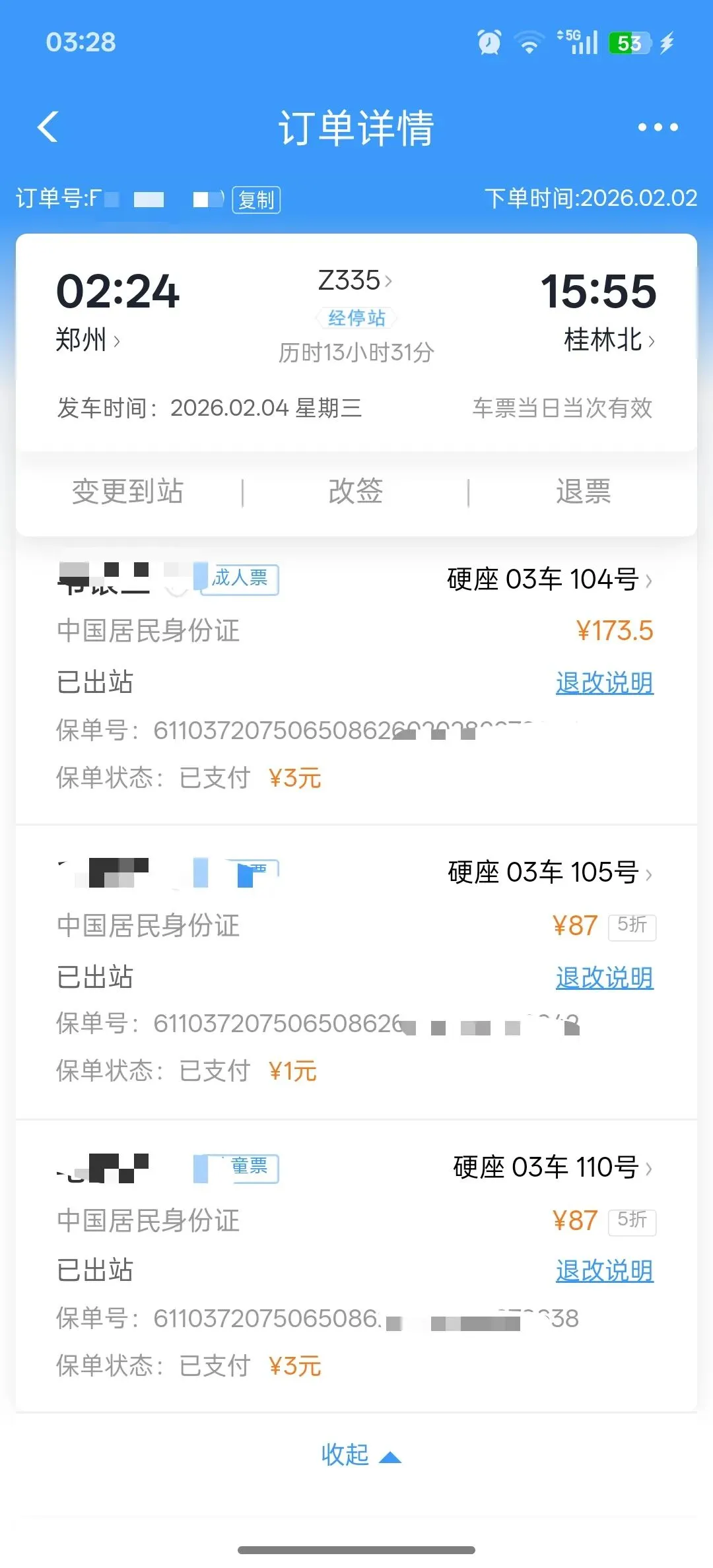 卧铺没抢到,在动车和绿皮火车之间,我选择了绿皮坐票,从郑州到桂林共计花了354.5元,其中7块钱是保险费,俺妞是1块钱的保险。