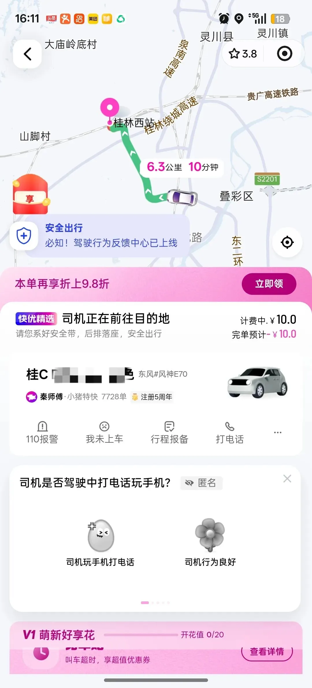 从桂林北打车到桂林西花了8元,大概10分钟