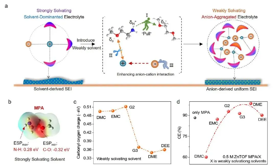 在此,郑州大学陈卫华团队通过一种强溶剂-弱溶剂竞争策略构建了均匀的SEI。研究阐明了其内在演化机制:弱溶剂的吸电子氧与二甲氧基乙胺的氨基氢通过竞争作用,驱动了溶剂化结构从环状锯齿构型向扩展线性构型的转变。这从而在基底界面处形成了高密度、阴离子聚集的溶剂化团簇,实现了SEI的均匀成核与二维生长。