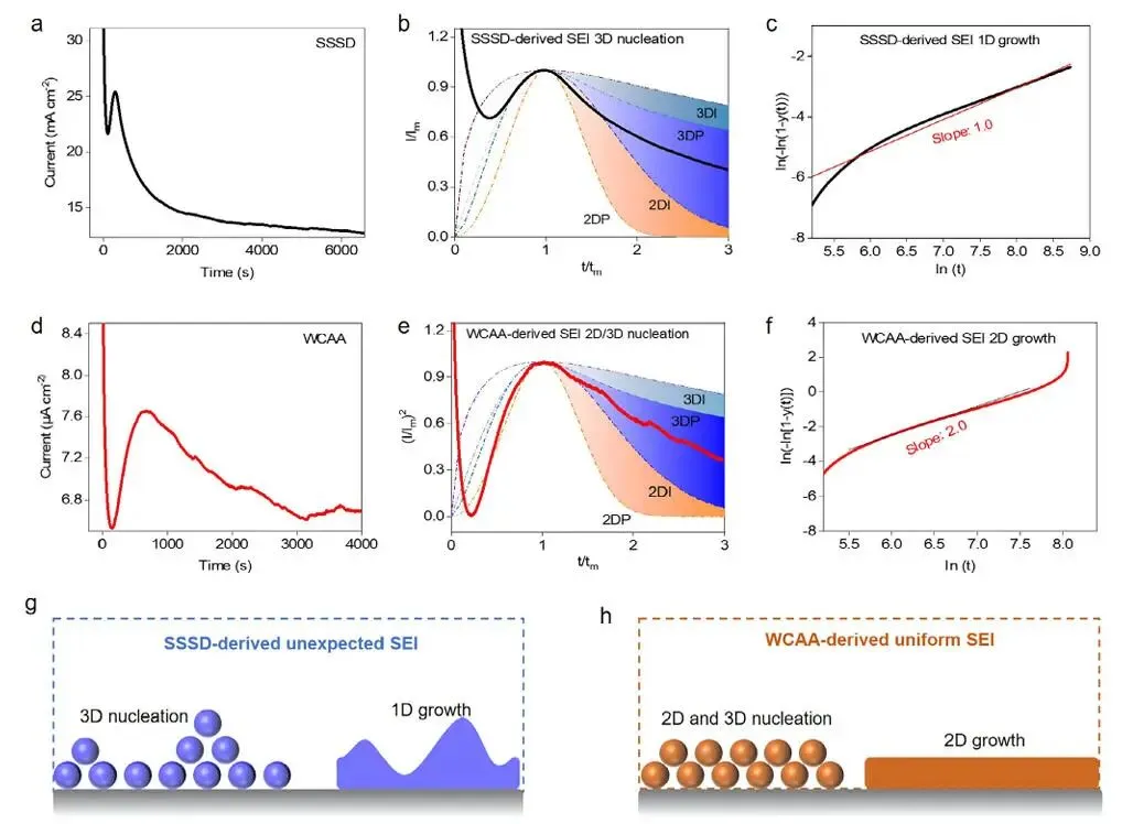 此外,基于电流-时间瞬态拟合和经典成核模型的分析,阴离子聚集电解质促进了遵循混合成核机制(结合二维瞬时成核与三维渐进成核)随后进行二维生长的SEI形成。这种独特的生长机制使得SEI能够实现基底表面的完美钝化。富含无机成分(ZnF₂、ZnCO₃和ZnS)的均匀SEI可以诱导锌的致密沉积并提高沉积/剥离的可逆性。