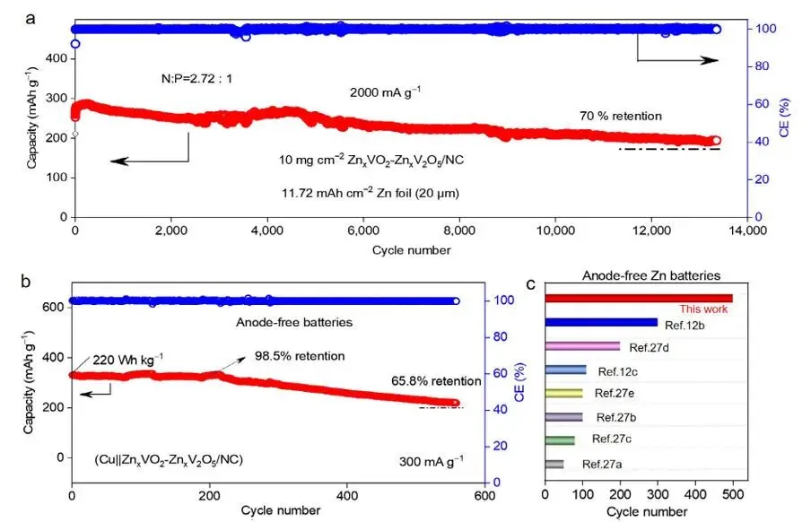 Zn||Cu电池表现出98.4%的高初始库仑效率,并在880小时内维持99.91%的平均库仑效率。采用ZnₓVO₂-ZnₓV₂O₅/NC正极(N/P = 2.72)组装的全电池在2 A g⁻¹下实现了13,000次循环。无负极锌电池展现出优异的循环稳定性(500次循环),容量保持率为65.8%。这项工作可为解决无负极电池的挑战提供界面设计方面的见解。