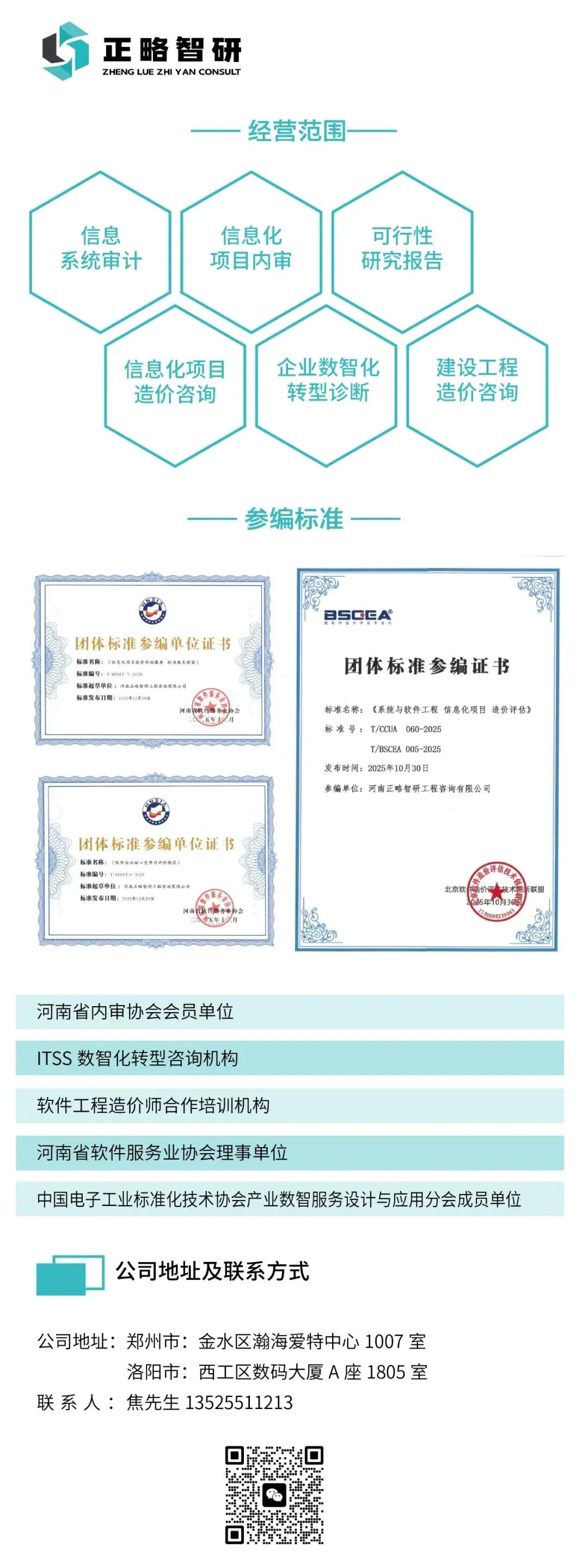 正略智研与中国计算机用户协会、河南省软件服务业协会合作,深度参与信息化项目造价相关行业标准、技术规范的编制工作,将标准化成果全面融入咨询服务全流程,为项目评审提供权威、合规的专业依据,有效破解信息化项目定价不统一、核算标准不明确等行业痛点,彰显公司在行业内的专业话语权。