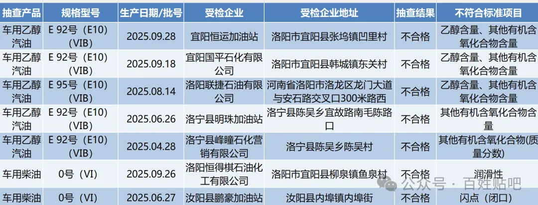 据公告数据,本次共检测汽油67批次,其中不合格5批次,主要不合格原因集中在乙醇含量和其他有机含氧化合物含量;柴油66批次,其中不合格2批次,不合格原因分别是润滑性和闪点(闭口)。不合格批次如下: