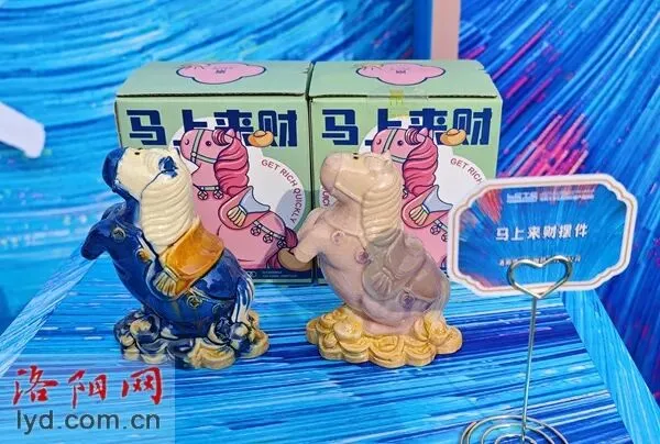 其中,高家三彩携手国家级非遗唐三彩烧制技艺传承人,与蜜雪冰城联名推出“马上雪王”系列周边,实现非遗技艺与大众消费场景的跨界破圈;意外博物研发的传国玉玺造型交通卡,将历史符号转化为日常实用好物,成功跻身网络爆款;三彩艺青年团队创作的陶瓷艺术音响《同心·未来》,作为联合国成立八十周年特别礼物,彰显了洛阳文创的国际影响力;张家彩窑与旺旺联名推出马年主题三彩作品,以年轻化设计贴合Z世代审美,实现传统文化的时尚表达。
