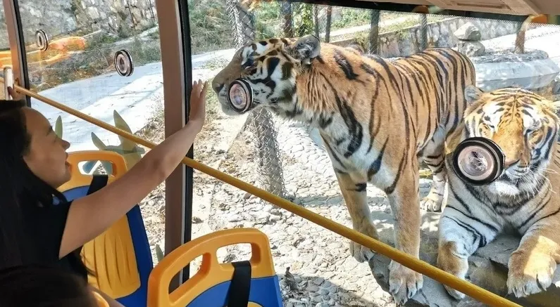 景区有122只东北虎,是国内唯一一家同时汇聚南北两大血统的东北虎散养和繁育基地。身边一群散放东北虎,你可以透过玻璃投食孔给老虎喂食。